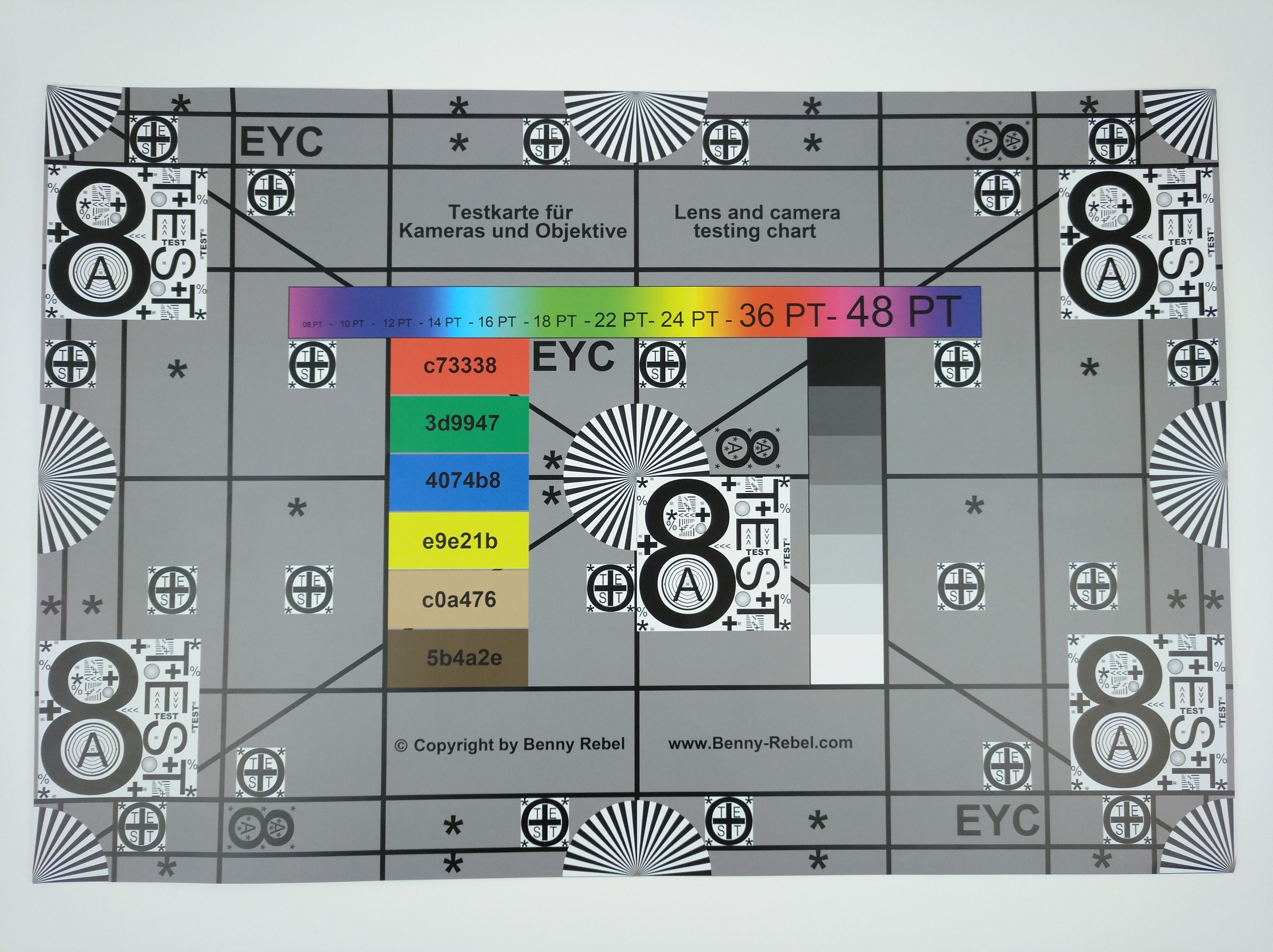 Szene 1Szene 2Szene 3Die Hauptkamera muss sich neben dem Praxiseinsatz auch im Labor bewähren, wo wir unter kontrollierten Lichtbedingungen einige Testbilder fotografieren. Beim Testbild überzeugen uns die recht hohe Schärfe und die etwas unscharfe, ansonsten aber saubere Darstellung von Text auf farbigem Hintergrund. Farbflächen wirken auch weniger verpixelt als bei vielen anderen Samrtphonekameras dieser Preisklasse. Zu den Bildrändern hin nimmt die Bildschärfe etwas ab.