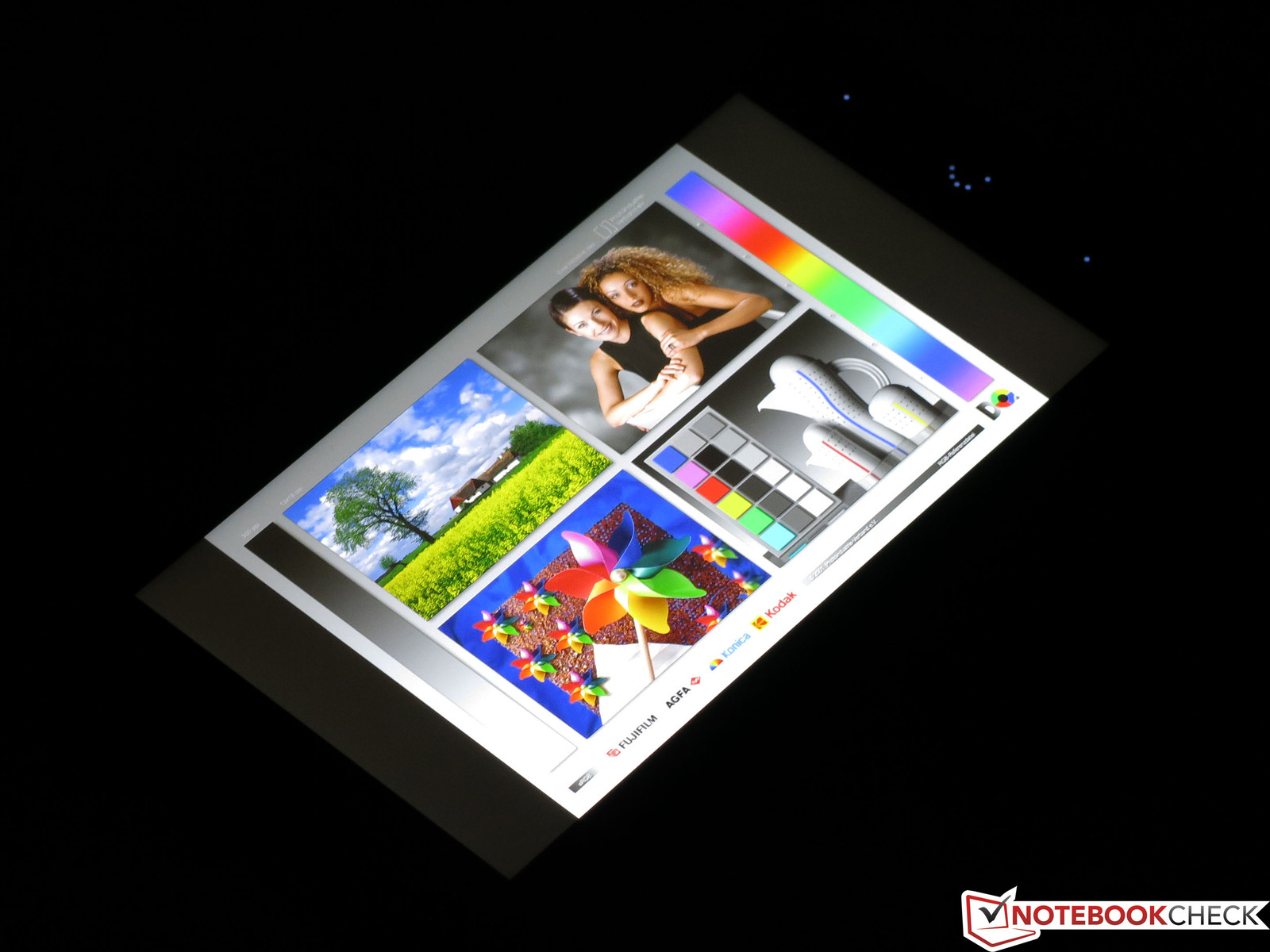 Bei flachen Blickwinkeln auf den Bildschirm nimmt dessen Helligkeit zwar etwas ab, Farbveränderungen gibt es dank des IPS-Panels aber nicht. Dunkle Bildbereiche erscheinen je nach Position des Betrachters allerdings aufgehellt, was typisch für diesen Display-Typ ist.