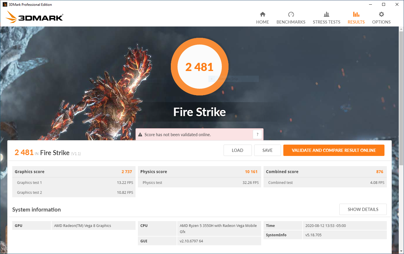 | 3DMark Fire Strike Score | 2481 Punkte | |
