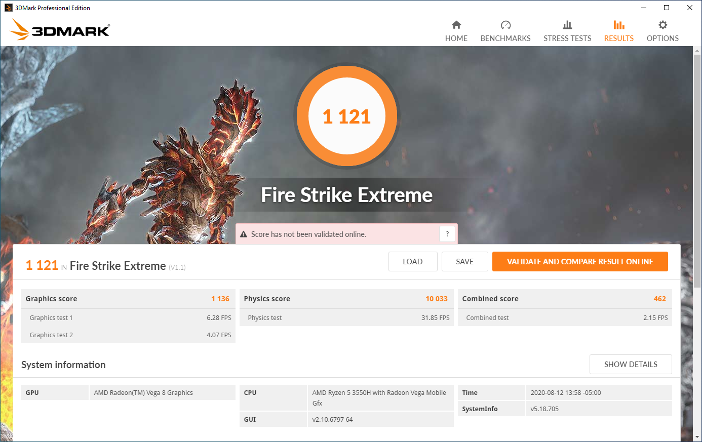 | 3DMark Fire Strike Extreme Score | 1121 Punkte | |