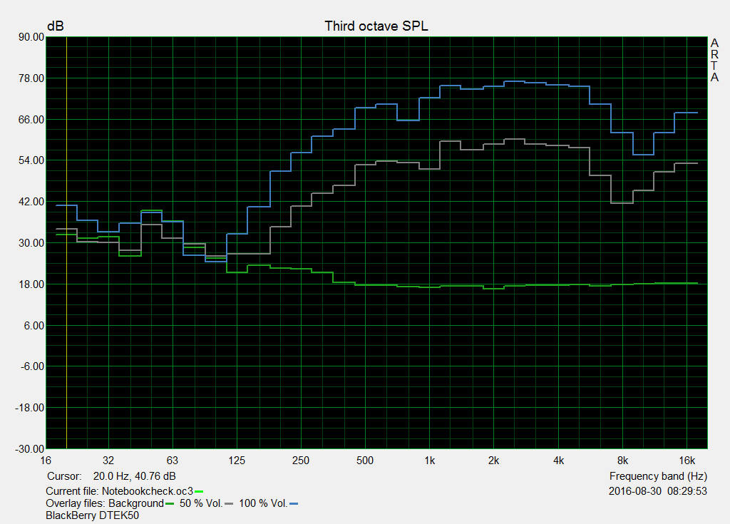 Die versteckt im Gehäuse untergebrachten Stereo-Lautsprecher des DTEK50 produzieren eine kräftige Klangkulisse und werden bis zu 86 dB(A) laut, ohne dabei zu verzerren. Wie bei den kleinen Smartphone-Klangmembranen zu erwarten, dominieren die Höhen, während Mitten kaum vorhanden sind und sich Tiefen bestenfalls erahnen lassen. Für die Wiedergabe von YouTube-Videos und das Abspielen der Musiksammlung reicht die Qualität aber auf jeden Fall aus.