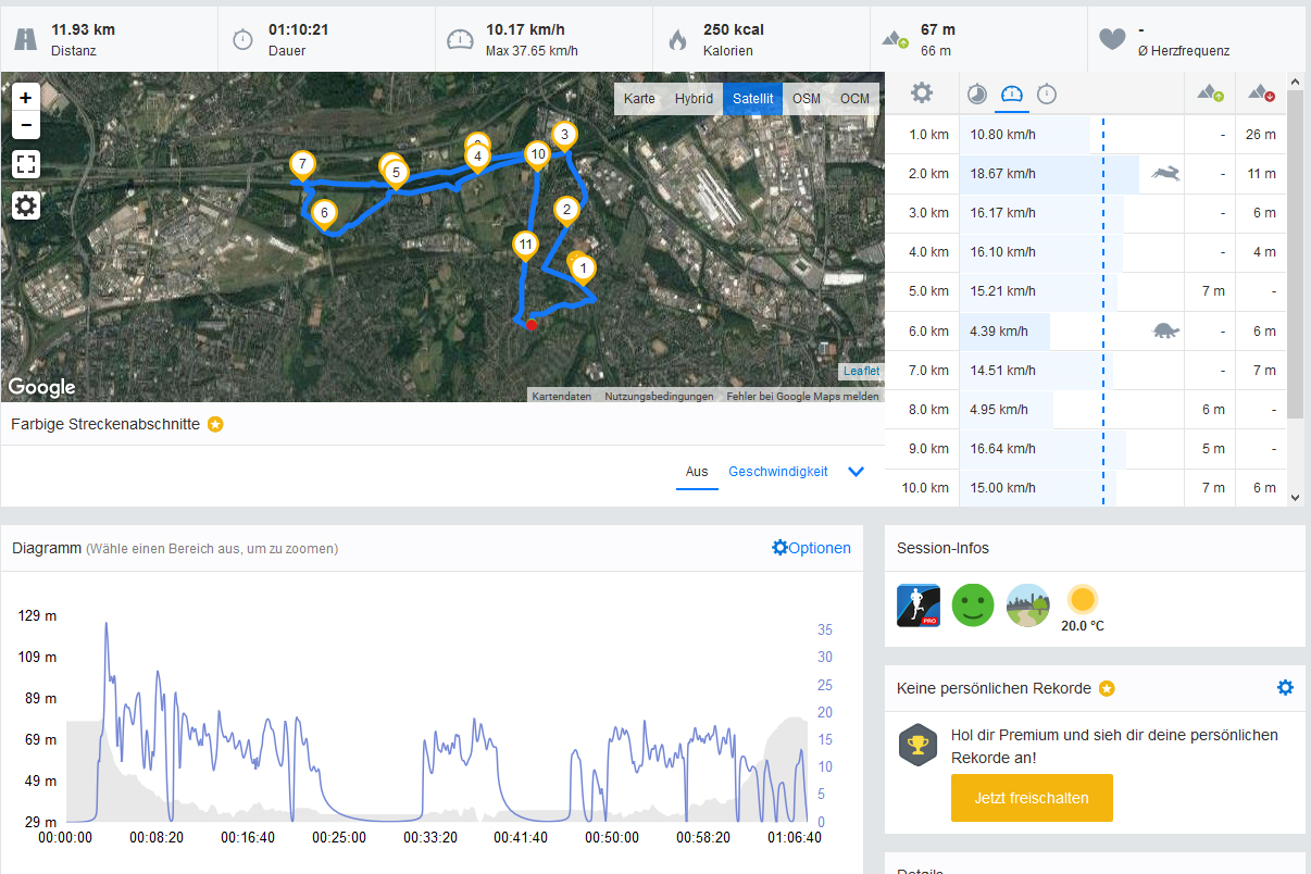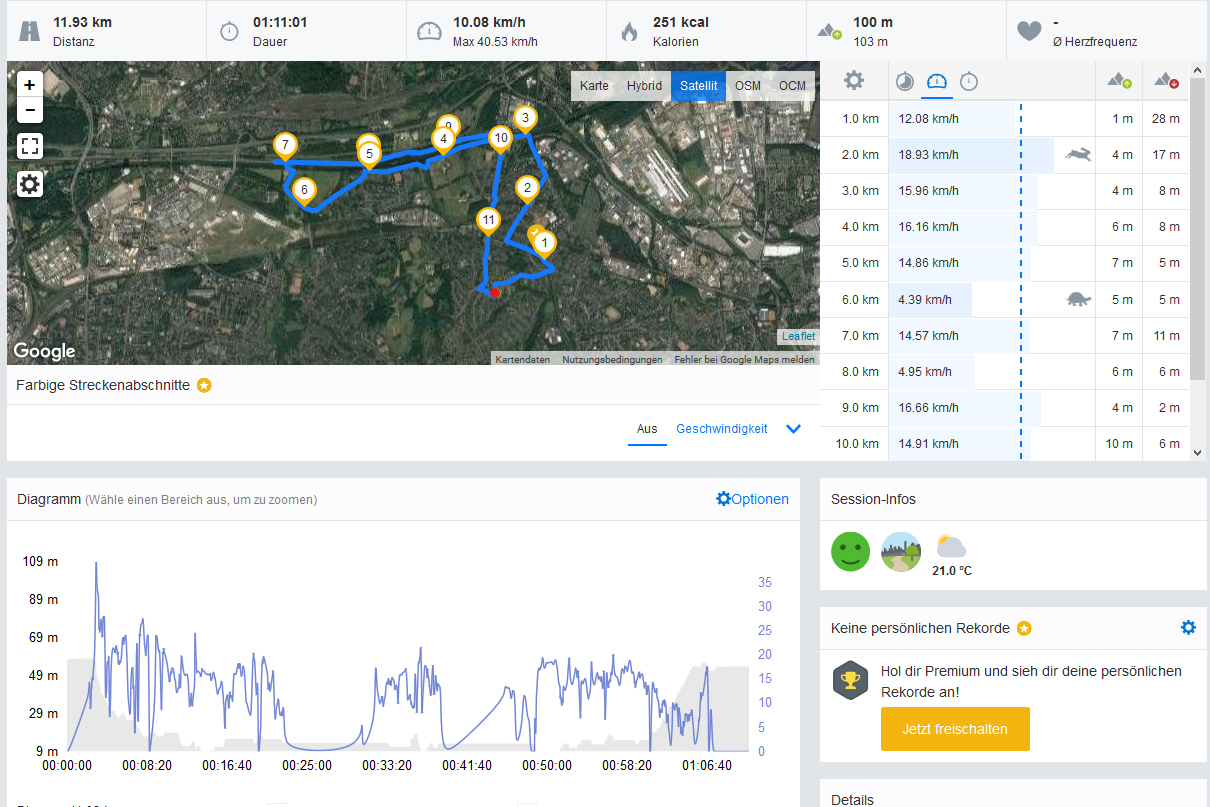 Wir packen das Testgerät zusammen mit einem Profi-Navi Garmin Edge 500 in unseren Rucksack und machen eine Fahrradtour. Beide Geräte messen exakt dieselbe Streckenlänge, das ist doch eine kleine Überraschung, da Smartphones und Tablets oft weniger Messpunkte nutzen und deshalb meist kürzere Strecken ermitteln. Das BlackBerry KEYone zeichnet tatsächlich auch die Strecke recht genau nach, aber dennoch nicht so exakt wie das Profi-Gerät. Für den Freizeit-Gebrauch reicht es aber allemal aus.