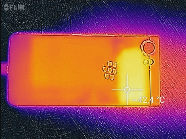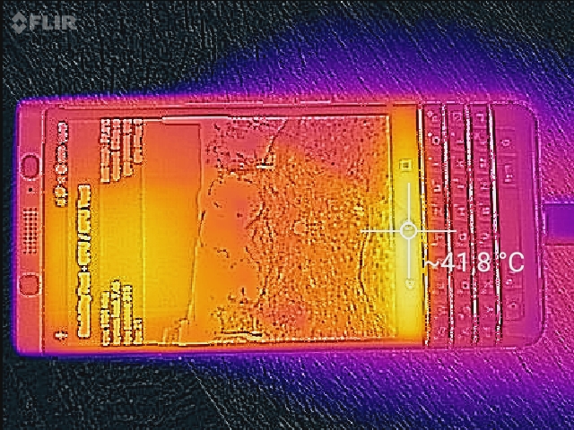 In dem wuchtigen Gehäuse des BlackBerry KEYone ist genug Platz vorhanden, um die Abwärme abzuleiten. Da das SoC auch nur mittlere Leistungwerte erbringt, steigt die maximale Gehäusetemperatur unter Last auf 39,6 °C im oberen Bereich der Rückseite. Das ist ein durchaus erträglicher Wert, der allerdings schon spürbar ist.