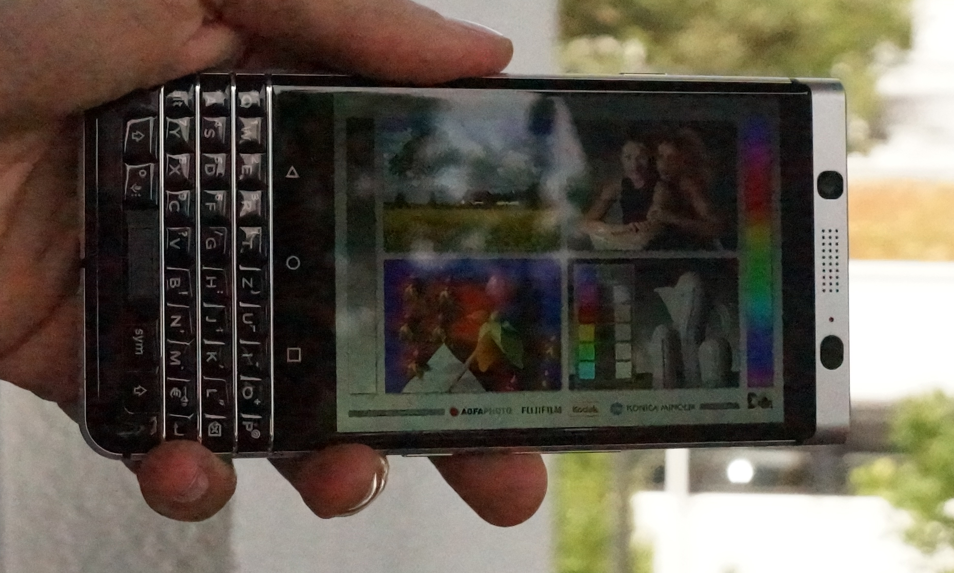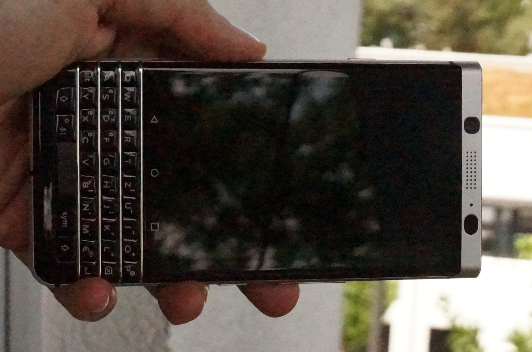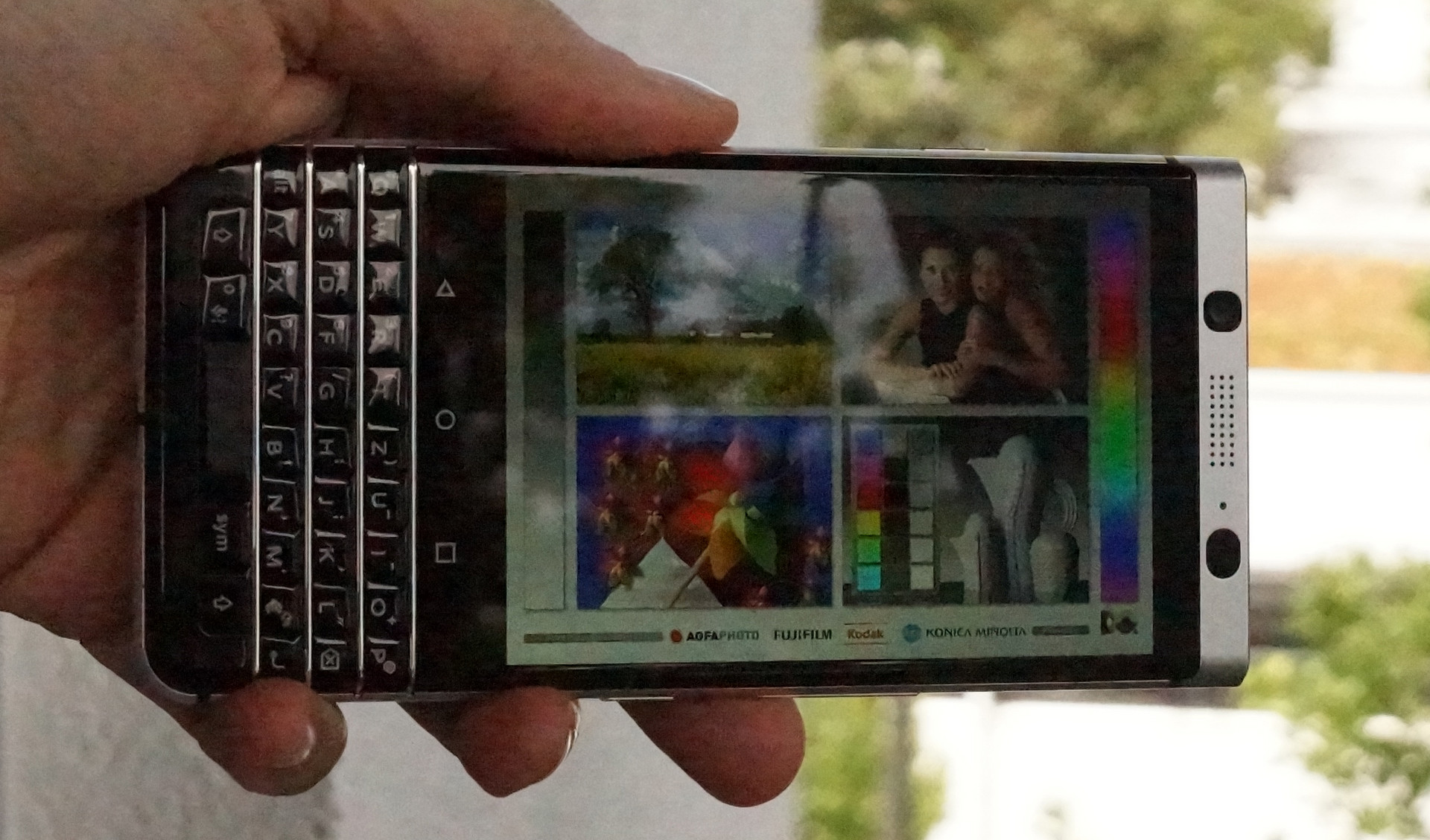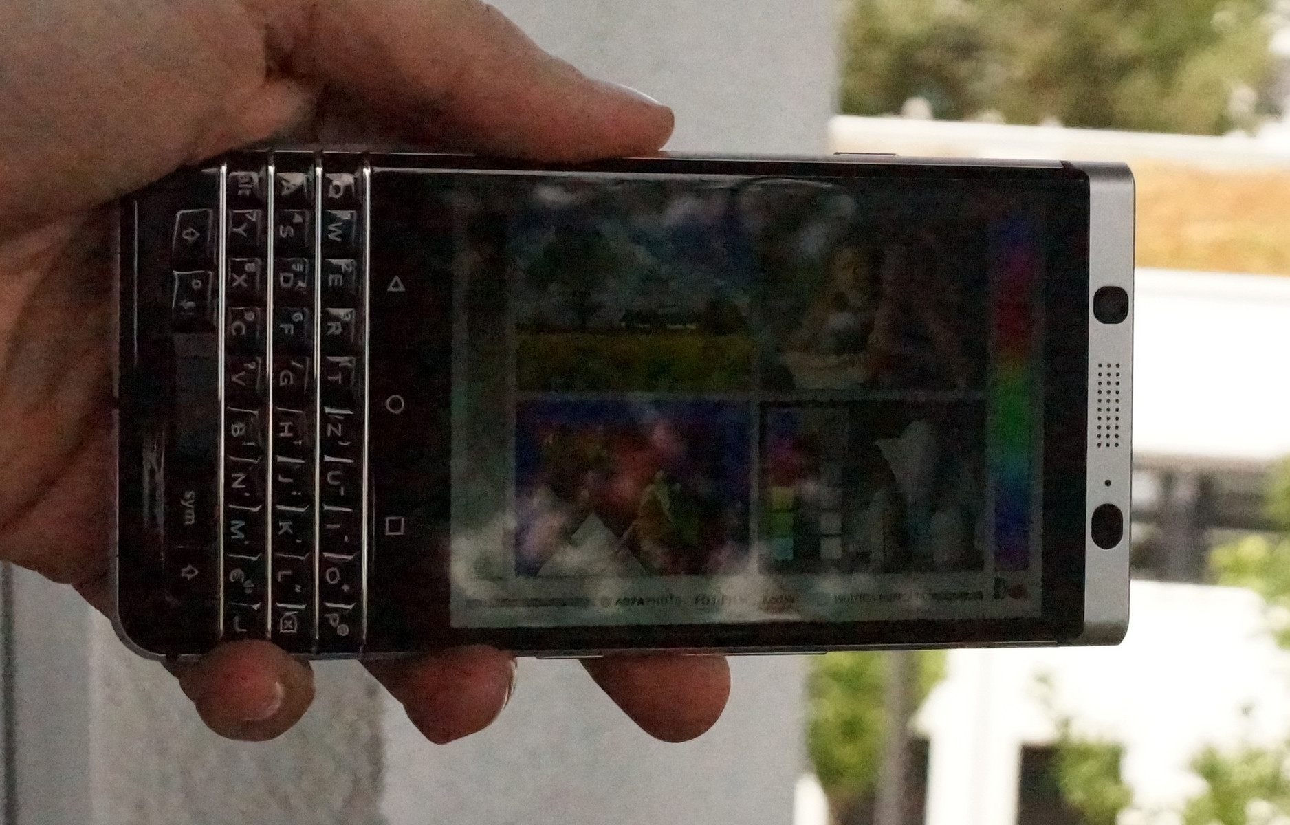 Die sehr hohe Helligkeit macht Bildschirminhalte auch im Freien gut sichtbar. Erst bei sehr hellem Licht und direkter Sonneneinstrahlung muss man sich in den Schatten zurückziehen. Beim Kippen zu den Seiten werden Farben nicht verzerrt und auch die Helligkeit wird nicht geringer, sodass man dem BlackBerry KEYone sehr gute Blickwinkelstabilität attestieren kann.