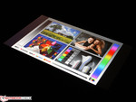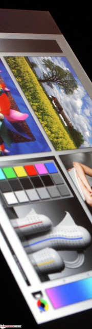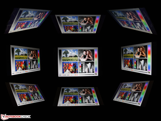 Die Blickwinkel sind aus jeder Position gut bis sehr gut. Das folgende Blickwinkel-Foto aus der Dunkelkammer lässt keine Farbverfälschungen erkennen, ganz gleich, aus welcher Neigung wir in die Anzeige schauen. Bei den Tablets mit hochwertigem IPS-Panel (iPad2, LG V900, Galaxy Tab 10.1, Motorola Xoom) sind solche breiten Blickwinkel aber keine Besonderheit.