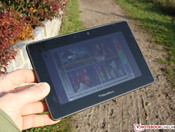 Auf Seiten der messbaren Mobilität zeigt sich der 7-Zoller von der besten Seite. Die Anzeige spiegelt zwar, kann sich mit 491cd/m² Helligkeit aber gegen das Sonnenlicht durchsetzen. Wer die Helligkeit draußen auf maximal setzt (Umgebungslichtsensor Off), der wird aber nicht die siebenstündige Laufzeit genießen können. Das kompakte, stabile Gehäuse ist ohne Tadel und der hohe Kontrast sorgt immer wieder für vergnügliche Blicke auf die schönen Bilder.