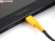 Die Ausrüstung mit Anschlüssen kommt minimalistisch daher. Neben Micro HDMI, zum Anschluss eines Fernsehers oder eines Flachbildschirms, gibt es nur noch einen Micro USB 2.0 Port. Für letzteren legt der Hersteller leider kein Kabel bei. Der Drei-Pin-Anschluss daneben ist lediglich die Verbindung zum separat erhältlichen Lade-Dock (Rapid Charging Pod). Zu guter Letzt können noch Kopfhörer angeschlossen werden. Von einem SD-Slot, um die Fotos von der Digitalkamera aus zu lesen, ist das PlayBook weit entfernt.