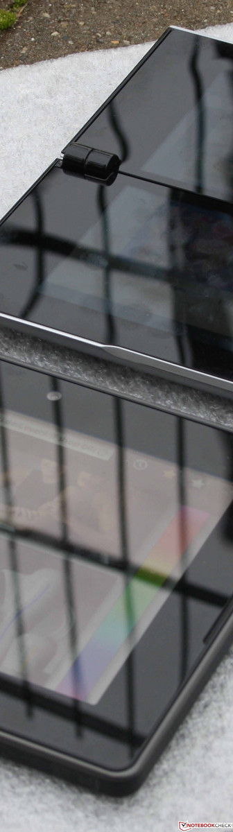 Das 7-Zoll IPS-Display löst mit 1.024x600 Pixeln (WSVGA) sehr hoch auf. Zum Vergleich: 10-Zoller haben tendenziell 1.280x800 Pixel. Die Fingereingabe funktioniert technisch wie üblich als kapazitiver Multi-Touch. Die spiegelnde Anzeige hinterlässt ein Meer von Fingerabdrücken, leider ein Manko, dass alle Tablets mit sich herumtragen.