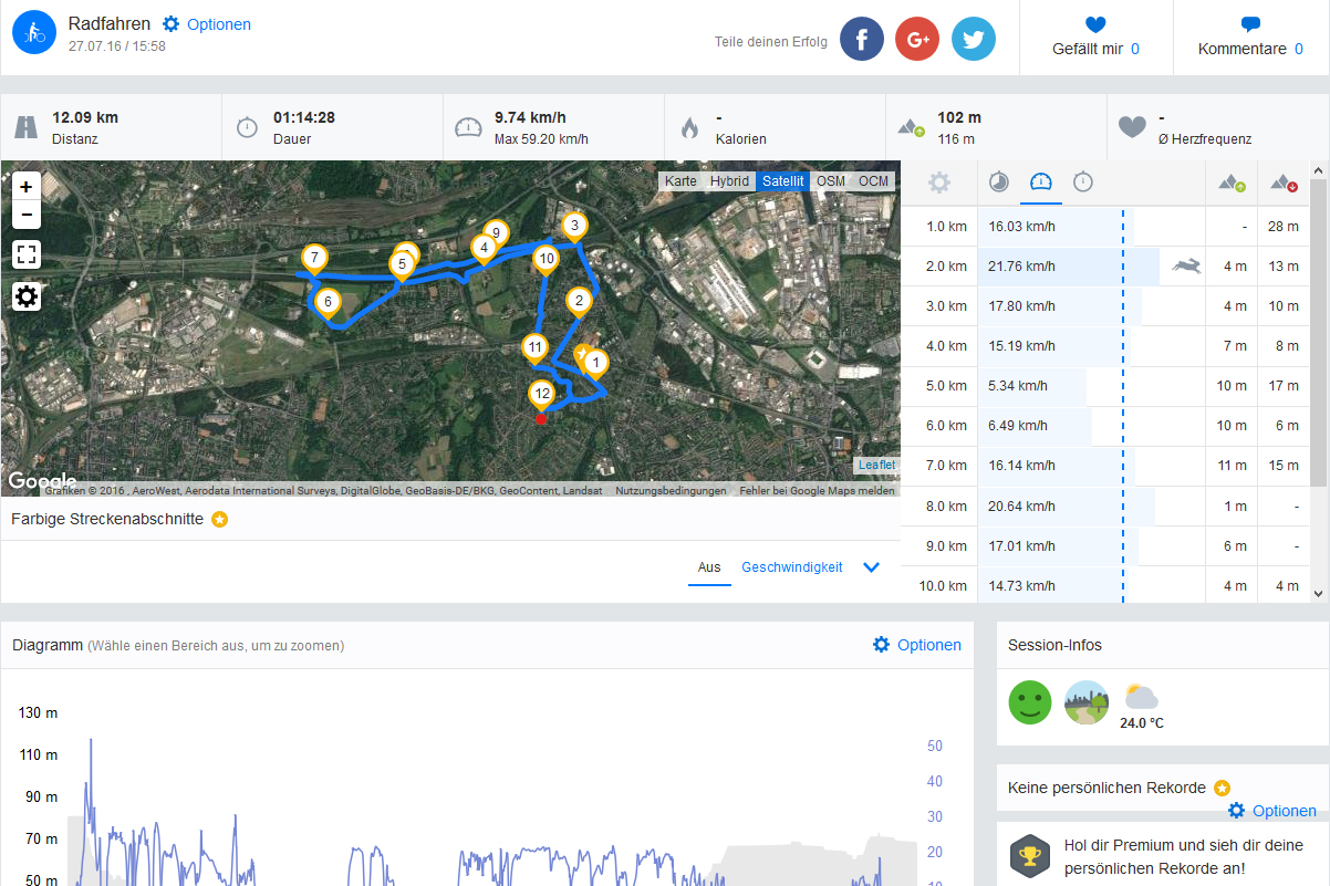 Auch das integrierte GPS-Modul bereitet im Alltag keine Probleme. Die eigene Position wird sowohl im Freien als auch in vielen Innenräumen sehr flott auf bis zu 3 Meter genau bestimmt. Der bei einer Testrunde mit dem Fahrrad aufgezeichnete Streckenverlauf offenbart im Vergleich zum GPS-Fahrradcomputer Garmin Edge 500 zwar auch einige Abweichungen – beispielsweise im Bereich der Brücke – allerdings summieren sich diese am Ende lediglich auf weniger als ein Prozent Gesamtstrecke – ein sehr guter Wert.