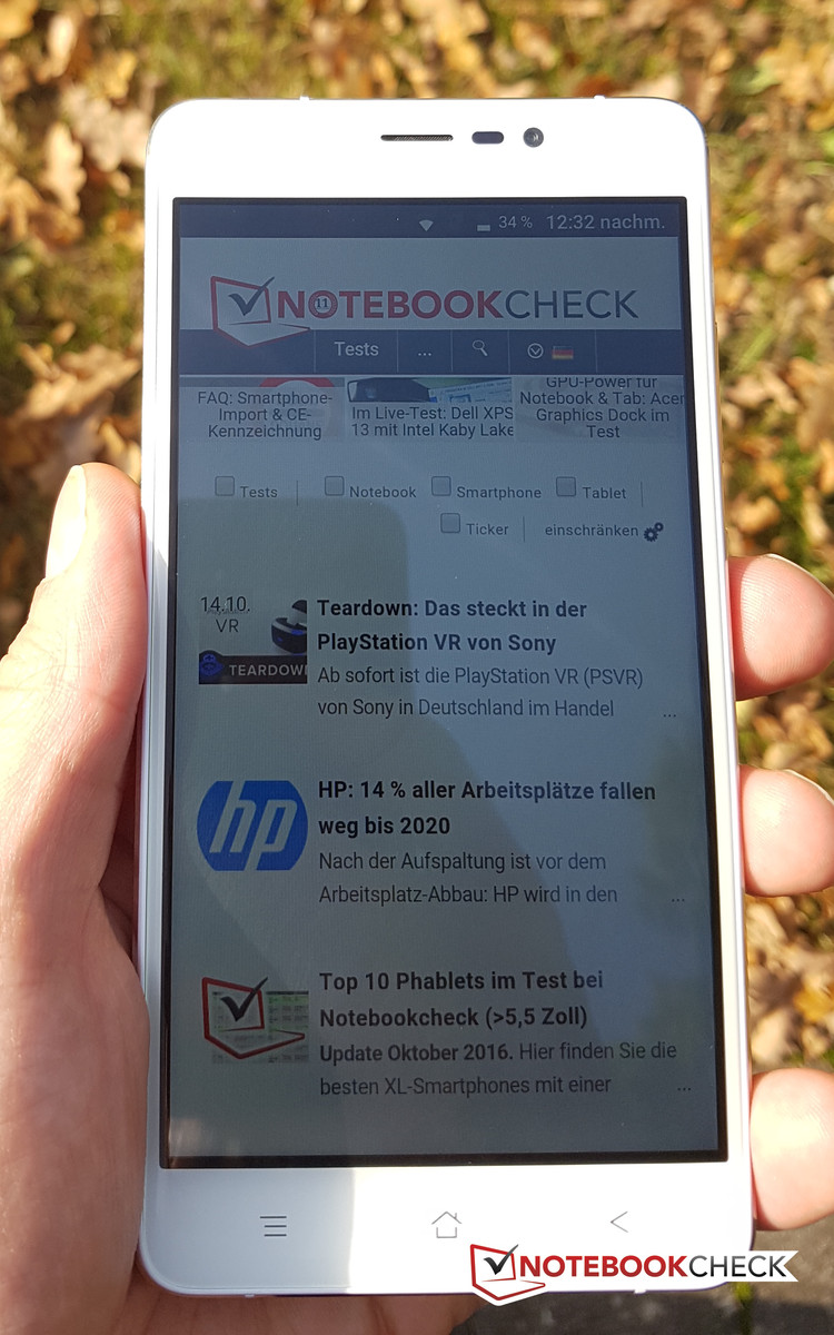Bei hellem Umgebungslicht macht das LC-Display des A8 Max eine gute Figur und bleibt stets ausreichend ablesbar. Unter direkter Sonneneinstrahlung gehen jedoch Inhalte durch Spiegelungen oder Reflexionen verloren. Dank der IPS-Technologie weist die Flüssigkristallanzeige des Einsteiger-Smartphones sehr stabile Blickwinkel auf. Selbst bei extremen Betrachtungswinkeln treten keine Farbverfälschungen auf.