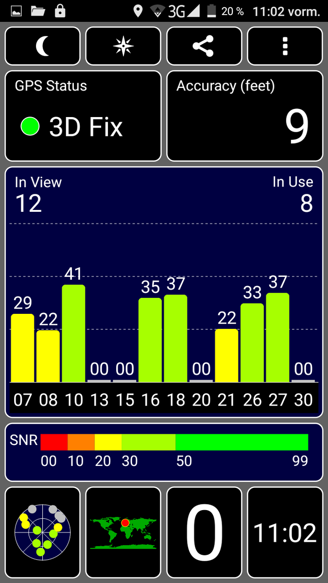 Die Positionsbestimmung gelingt mittels des GPS-Satellitensystems. Der Satfix im Freien erfolgt nach kurzer Zeit auf 3 Meter genau. In einem Gebäude konnte keine Satellitenverbindung hergestellt werden. Das GPS-Modul des Einsteiger-Smartphones ortet die Position relativ ungenau und zeigt im Vergleich zu dem Profi-Navi Garmin Edge 500 am Ende der 12,2 Kilometer langen Teststrecke eine Differenz von 300 Metern.