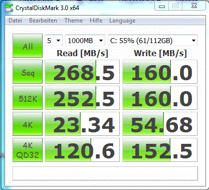 Der Intel Flash-Speicher (330 Series SSDSC2CT120A3K5, 120 GB) bietet SSD-typisch extrem kurze Zugriffszeiten, vor allem bei den kleinen Dateien. Die Zugriffszeit von 0,1 ms ist ein Indiz dafür und die 512K- sowie 4K-Tests zeigen den Speicher in der Gesellschaft einer teuren Fujitsu Workstation mit Micron RealSSD C400 (256GB). Nur eine Samsung SSD 840 (+25 %) oder die ADATA S510 (+20 %) kann im 4K-Test noch einen Tick schneller lesen. Das Latitude ATG mit seiner Lite-On LAT-256M2S (-47 %) kann hier nicht mehr mithalten.