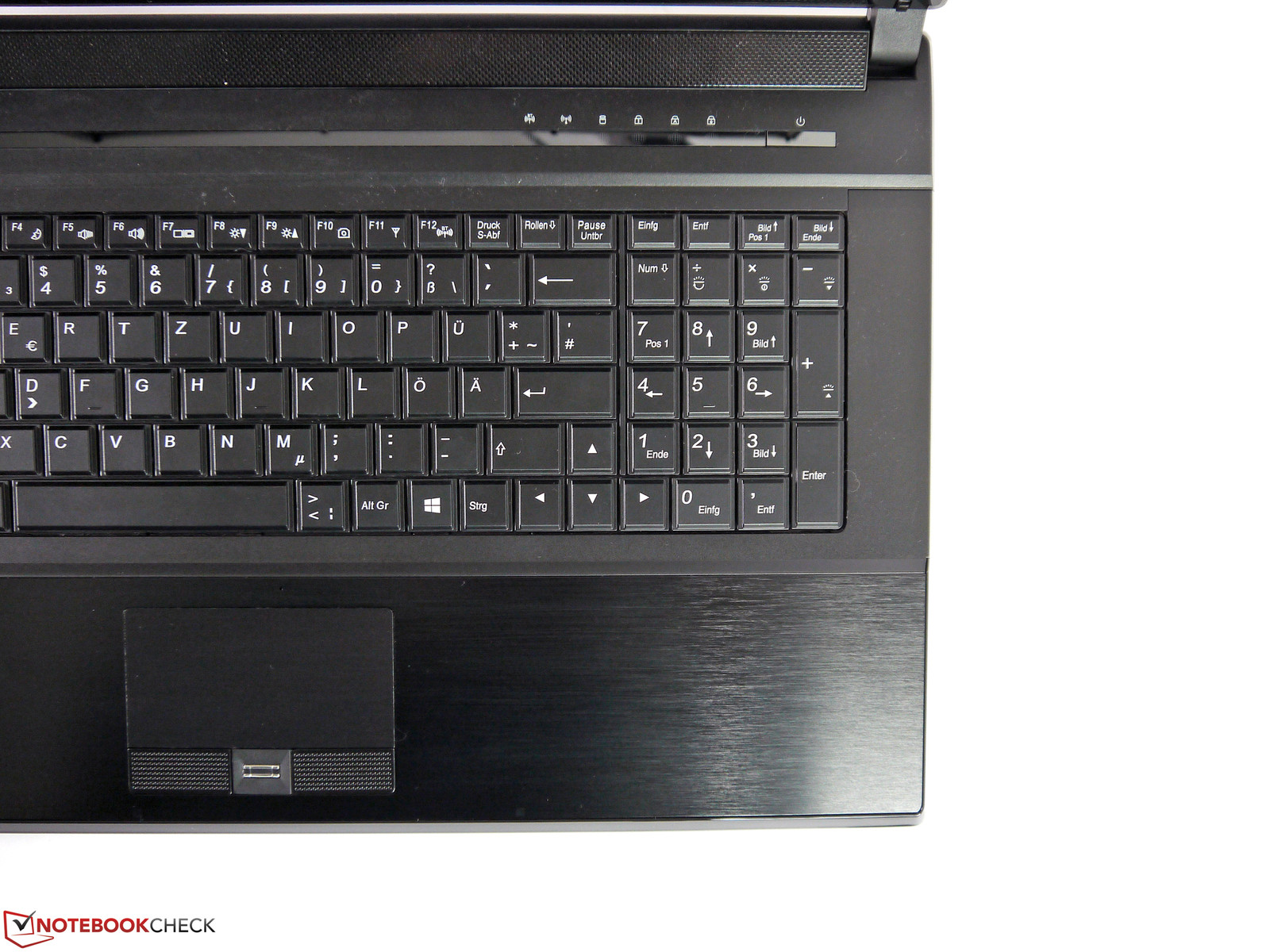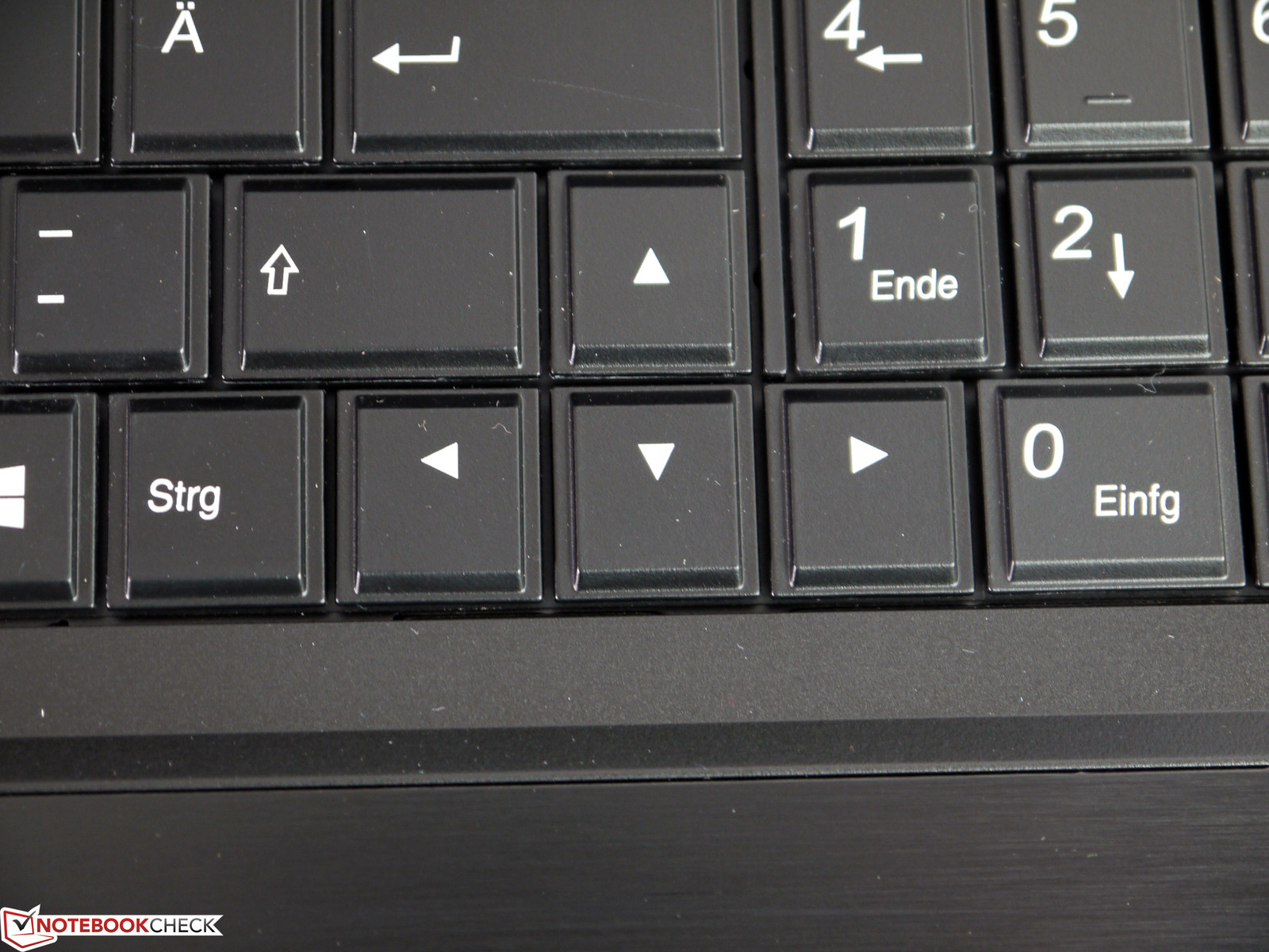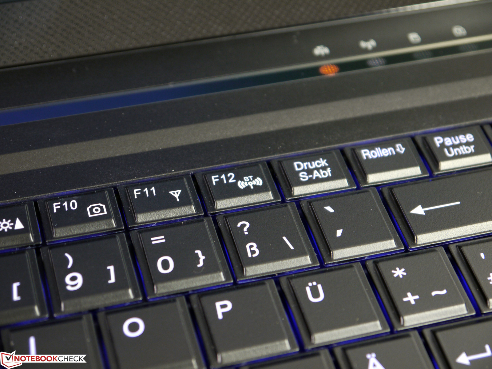 Die Tastatur mit separatem Nummernblock verfügt über normalgroße Tasten im 19-mm-Raster und liegt insgesamt fest auf. Ein Nachwippen ist nur minimal feststellbar und sollte im Regelbetrieb für keinerlei Nachteile sorgen. Der Anschlag mit mittlerem Hub und gutem Druckpunkt gefällt und dürfte auch den meisten Vielschreibern entgegenkommen. Etwas klein geraten ist die Return-Taste, dafür sind wiederum die Pfeiltasten ausreichend groß und mit dem Standard-Abstand ausgeführt. Das kontraststarke Layout unterscheidet sich etwas vom sonst üblichen und erfordert hier und da ein wenig Umgewöhnung. Die Windows-Taste befindet sich hier auf der rechten Seite und die „<>“-Taste hat sich zwischen „Space“ und „Alt Gr“ gedrängelt. Ansonsten findet man viele FN-Kombinationen, mit denen man schnell auf die üblichen Hardware-Funktionen Einfluss nehmen kann. Gegen einen Aufpreis von 60 Euro sind auch Layouts in anderen Sprachen erhältlich. Die blaue Tastaturbeleuchtung lässt sich in 10 Schritten fein dosieren und ist vor allem in dunklen Arbeitsumgebungen ein willkommener Mehrwert.