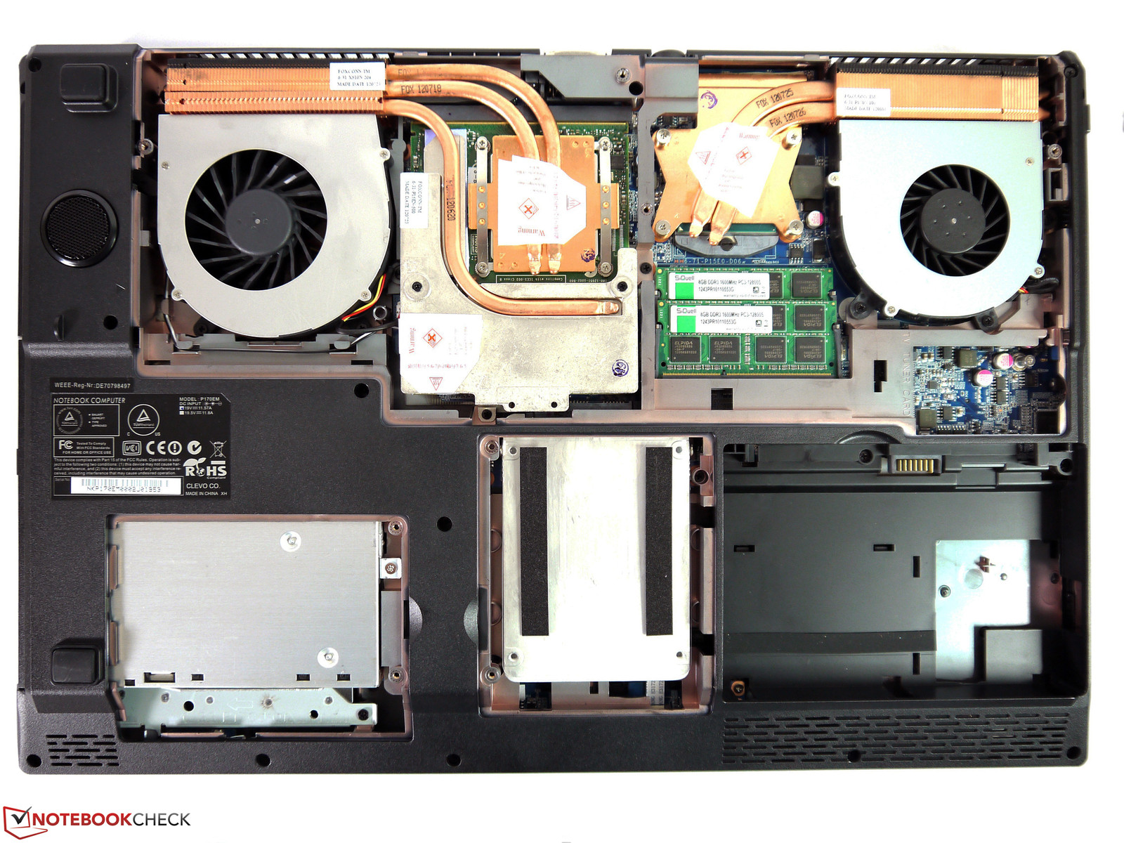 Die am Unterboden verteilten Öffnungen lassen sich einfach per Schraubenzieher öffnen und erlauben so eine unkomplizierte Aufrüstung der Komponenten oder Reinigung der Lüfter. Etwas mehr Aufwand muss man betreiben, um an die beiden zusätzlichen RAM-Steckplätze unter der Tastatur zu gelangen. Im Regelfall sind diese aber schon vom Hersteller bestückt und müssen erst dann aufgesucht werden, wenn der Maximalausbau angegangen werden soll. Eine Erweiterung darf auch hier vom Anwender durchgeführt werden, geschieht dies allerdings unsachgemäß mit Beschädigungen, so erlischt wie üblich die Garantie.