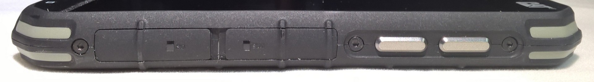 Die Schächte für Speicher- und SIM-Karte sind von außen zugänglich und werden durch Klappen geschützt. Vor allem der SIM-Karten-Slot ist sehr fest verschlossen und kann nur mit einem flachen Schraubenzieher als Hilfsmittel geöffnet werden. Die Tasten links und rechts am Gerät können auch mit Handschuhen gut ertastet werden. Das Tastenfeedback ist dabei sehr deutlich. Neben Power-Knopf und Lautstärkeregler, ist das S31 mit einer frei belegbaren Taste ausgestattet. Im entsprechenden Menü lassen sich für kurzes und langes Drücken der Taste verschiedene Aktionen auswählen. Es können beispielsweise Apps gestartet, Anrufe entgegengenommen oder Benachrichtigungen gesendet werden. Alternativ dazu kann die Taste auch eine Push-to-Talk-Belegung erhalten.