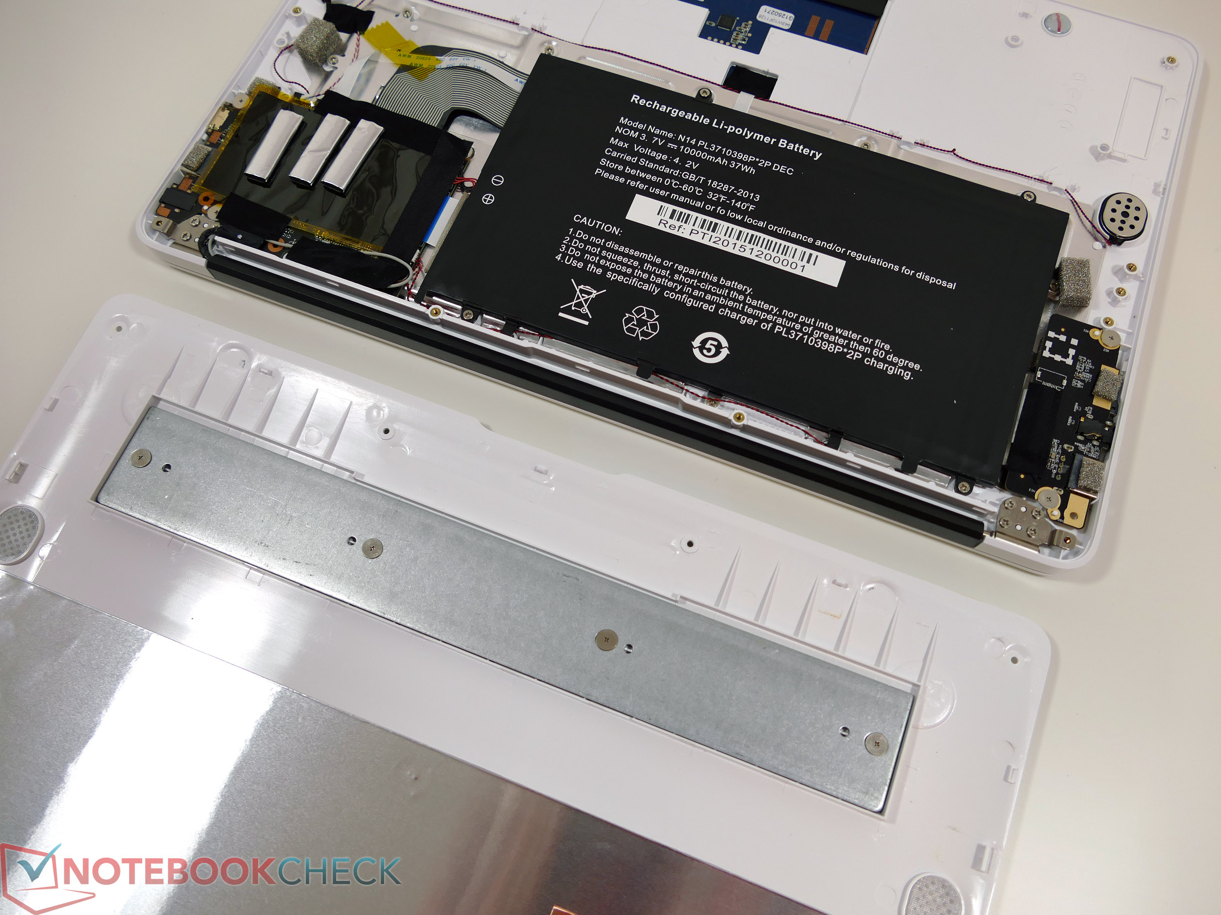Verblüfft waren wir auch als wir im Inneren ein Gewicht im vorderen Bereich des Notebooks entdeckten. Kostenbedingt hat man hier offenbar auf die Wahl eines schlankeren Akkus verzichtet und stattdessen einfach eine gewichtige Metallschine (rund 150 Gramm) im dünnen vorderen Bereich des Gerätes platziert, um die Neigung zum Kippen des Notebooks zu entschärfen. Funktioniert, ist aber nicht unbedingt die eleganteste Lösung, um diesen Effekt zu erreichen.