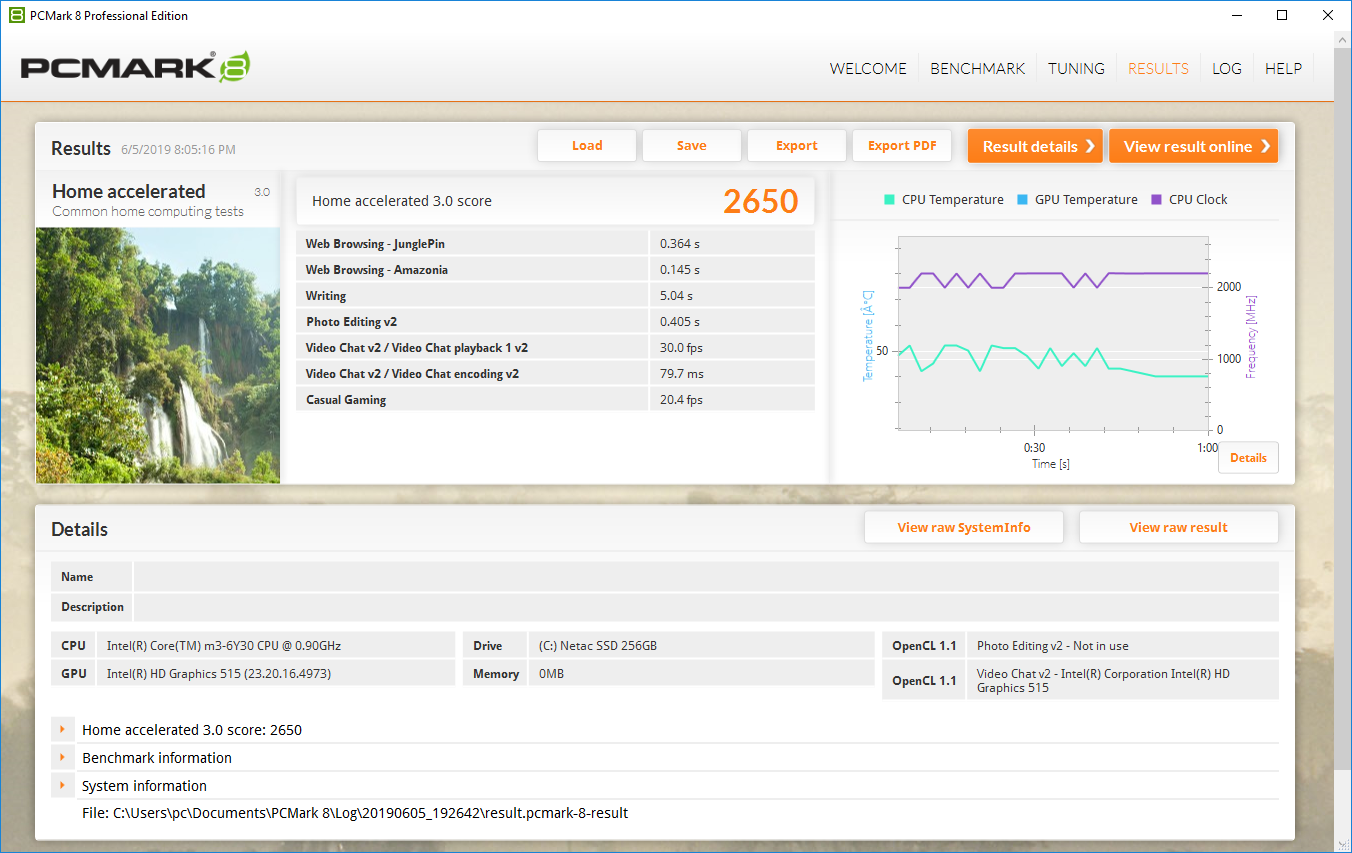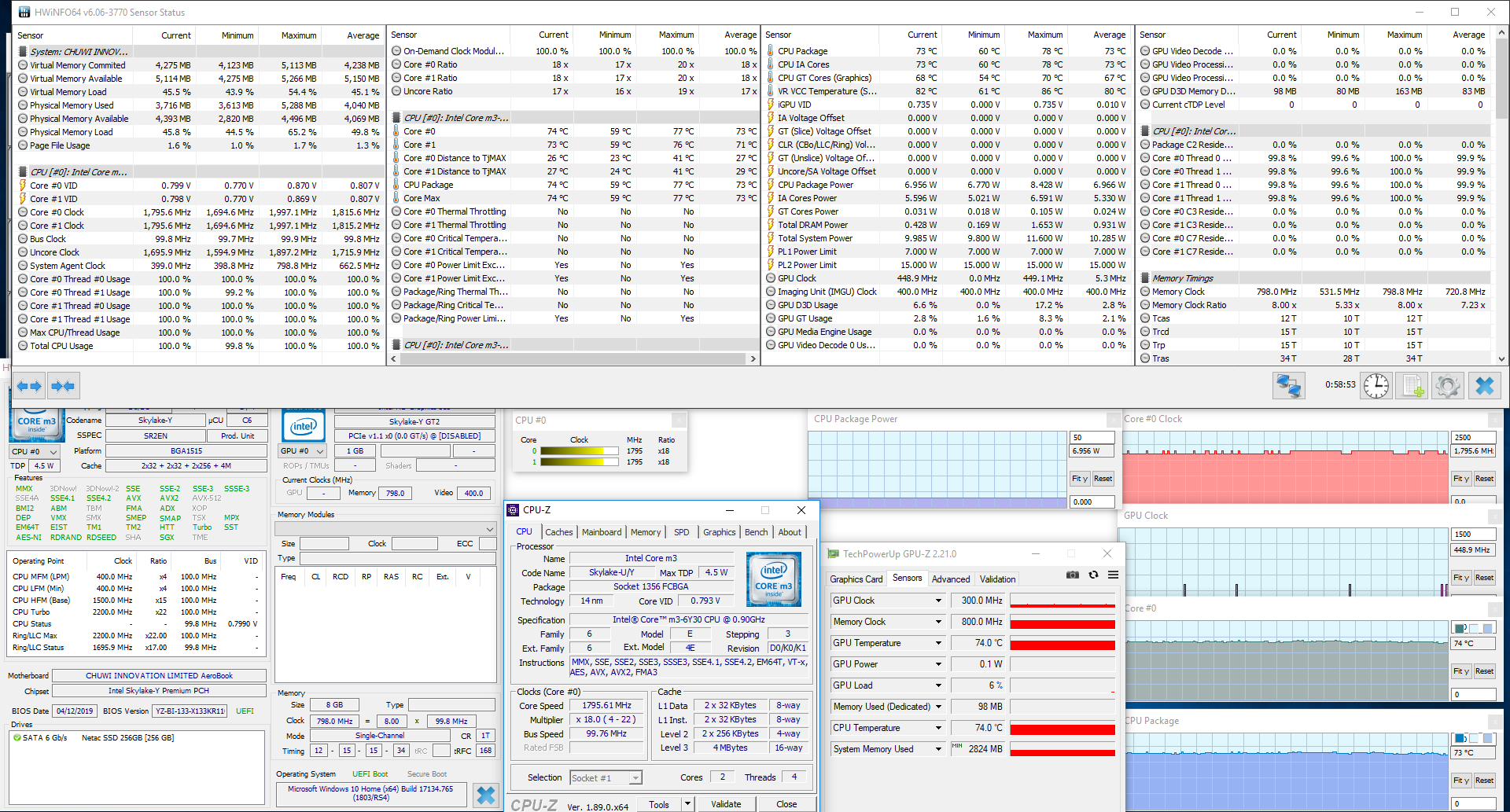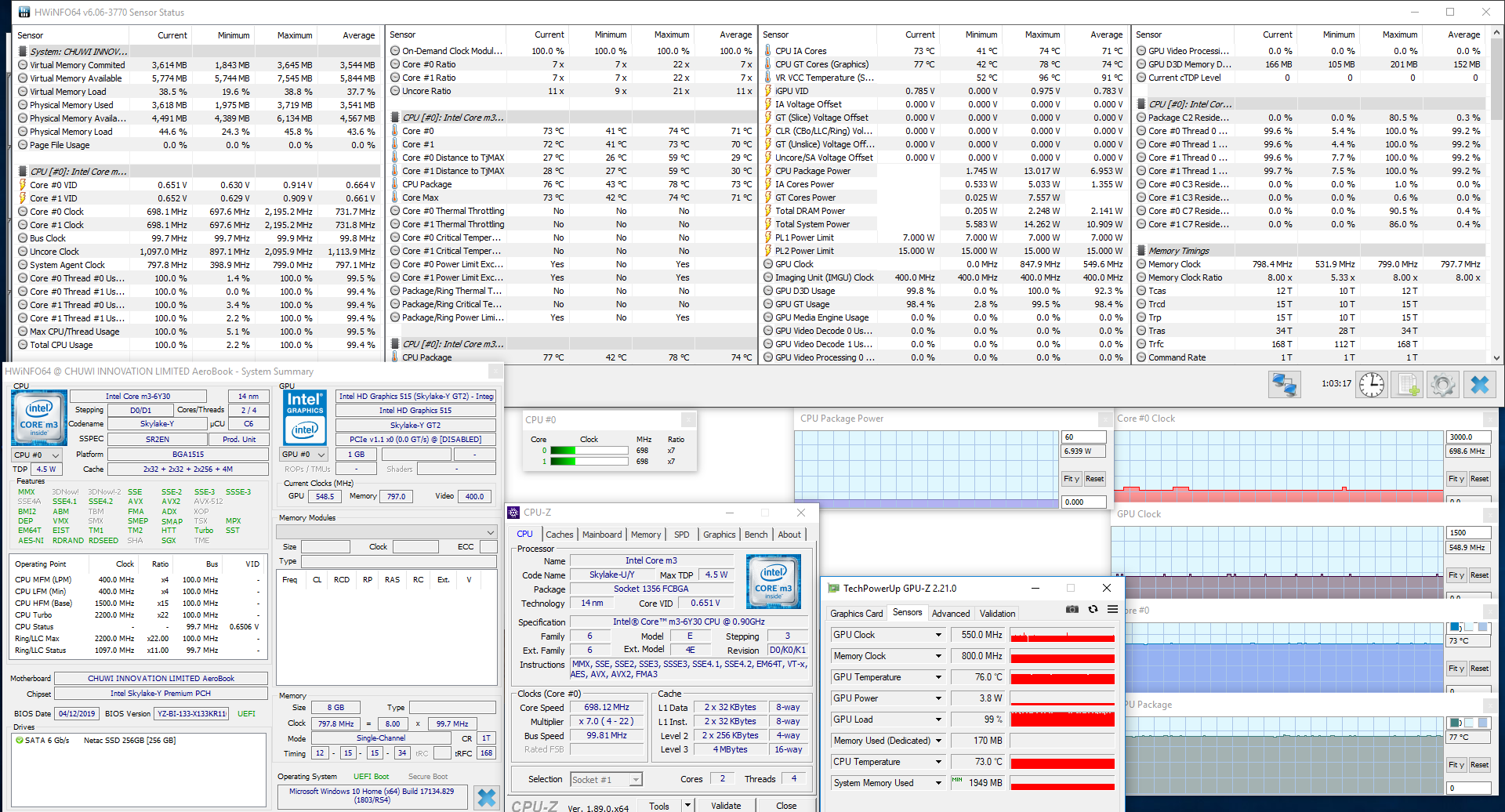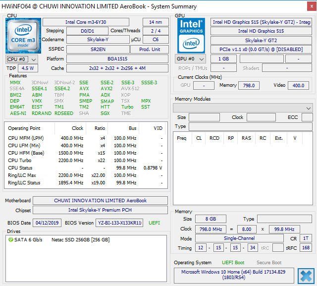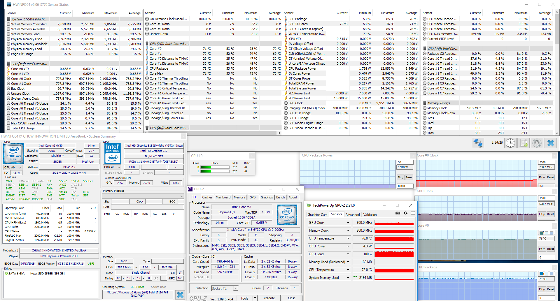 Der Intel Core m3-6Y30 im AeroBook ist eine recht ungewöhnliche Wahl. Die Skylake-CPU ist nun fast vier Jahre alt und konnte selbst zu seiner Zeit im Jahre 2015 nicht mit ausgezeichneter Performance brillieren. Der Dual-Core-Chip mit Hyperthreading kann mit den meisten Mitstreitern nicht mithalten. Selbst das billige Asus E203MA kann das AeroBook dank leistungsfähigerem Pentium Silver N5000 schlagen. Vermutlich hat Chuwi sich aus Kostengründen für den Core m3-6Y30 entschieden. Der Hersteller hat Intel möglicherweise Restware des Chips billig abgekauft. Noch dazu unterstützt dieser alte Prozessor nur DDR3-RAM. Immerhin ist dessen Leistung unter anhaltender Last stabil.