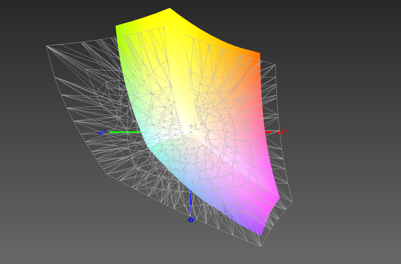 Die Farbgenauigkeit ist durchschnittlich: Die DeltaE-2000-Werte liegen für Farben bei 7,31 und bei den Graustufen bei 6,8 (Für Nutzer, die professionell mit Farben arbeiten, sind grundsätzlich DeltaE-2000-Ergebnisse von bis zu 3 akzeptabel.). So gesehen ist das AeroBook also nicht für professionelle Bildbearbeitung geeignet. Unsere Kalibrierung konnte die Farbgenauigkeit deutlich verbessern, dennoch sind die Displays der Apple-Geräte deutlich besser. Wir konnten aufgrund der hohen Farbtemperatur (7.695 K) ebenfalls einen Blaustich erkennen, der allerdings durch die Kalibrierung ausgebessert wurde.