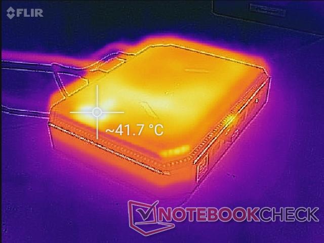 Mit über 30 °C im Leerlauf auf dem Desktop sind die Oberflächentemperaturen im Bereich der linken Ecke unseres Testgeräts am höchsten. Eben diese Stelle kann sich unter schwerer Last beim Streamen oder Browsen auf bis zu 42 °C erwärmen. Die Temperaturen sind insgesamt niedriger als auf der leistungsfähigeren ZBox CI660 Nano, die über 60 °C erreichen kann. Falls DVDs oder andere Gegenstände auf dem Gerät gelagert werden sollen, muss berücksichtigt werden, dass sie sich deutlich erwärmen werden.
