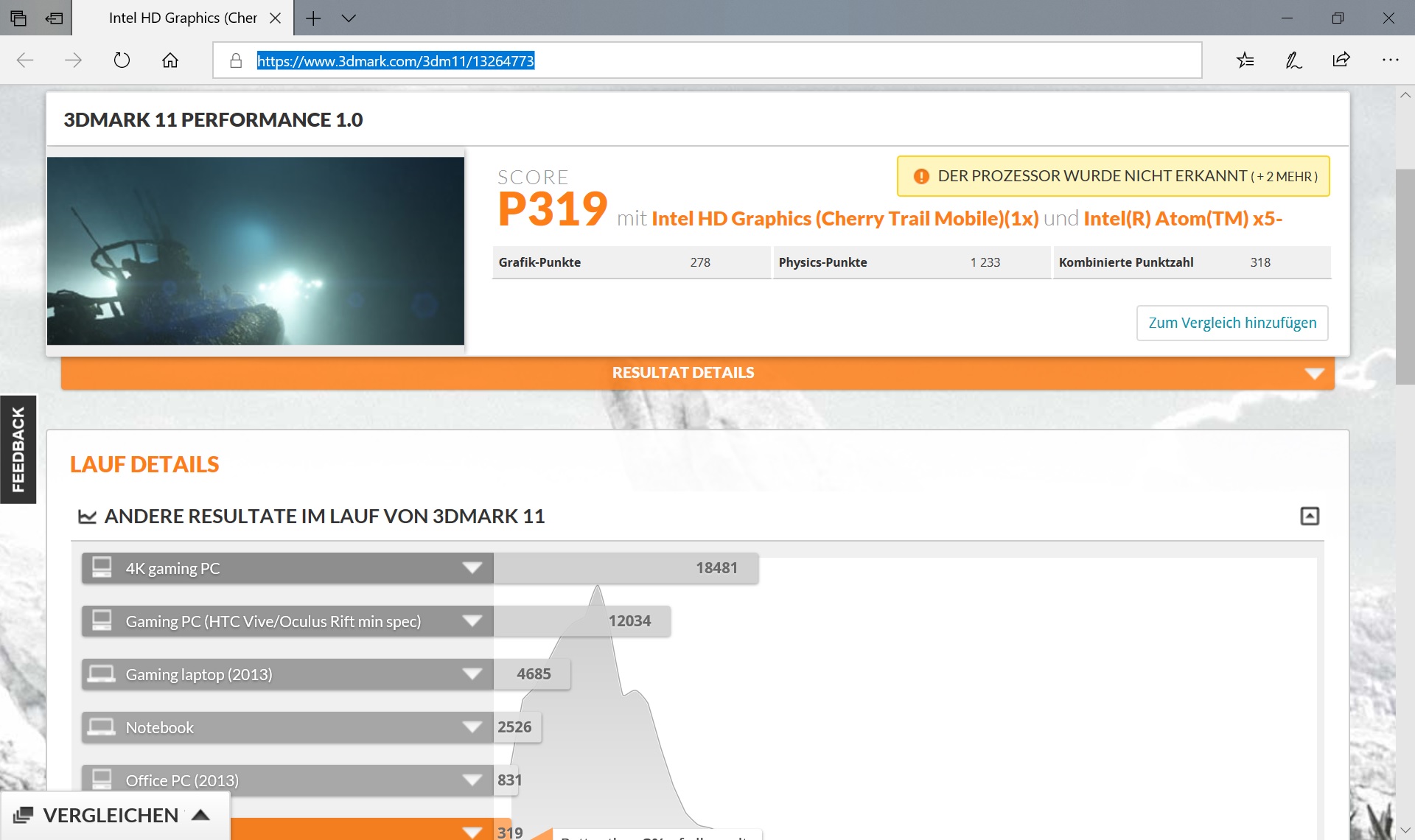 Im 3DMark 11 liegt das Chuwi auf dem letzten Platz, leider auch rund 15 % unterhalb dessen, was man von der Cherry-Trail-Grafik erwarten dürfte.