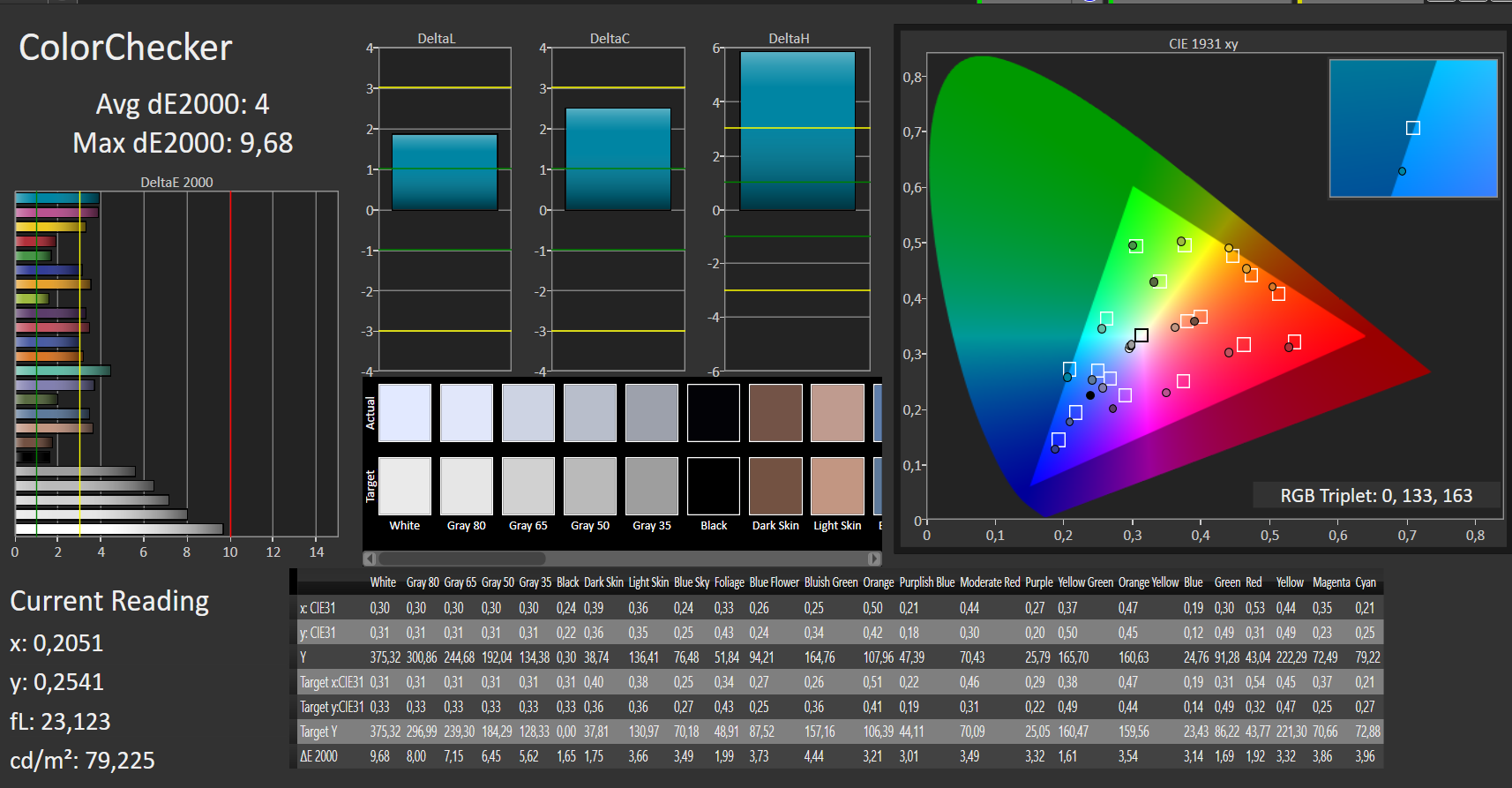 | Colorchecker dE 2000 max. * | 9.68 | 11.2 -16% | 24.45 -153% | 9.39 3% | 3 69% |