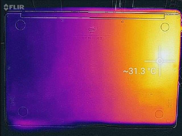 (+) Die Handballen und der Touchpad-Bereich erreichen maximal 35.2 °C und damit die typische Hauttemperatur und fühlen sich daher nicht heiß an.