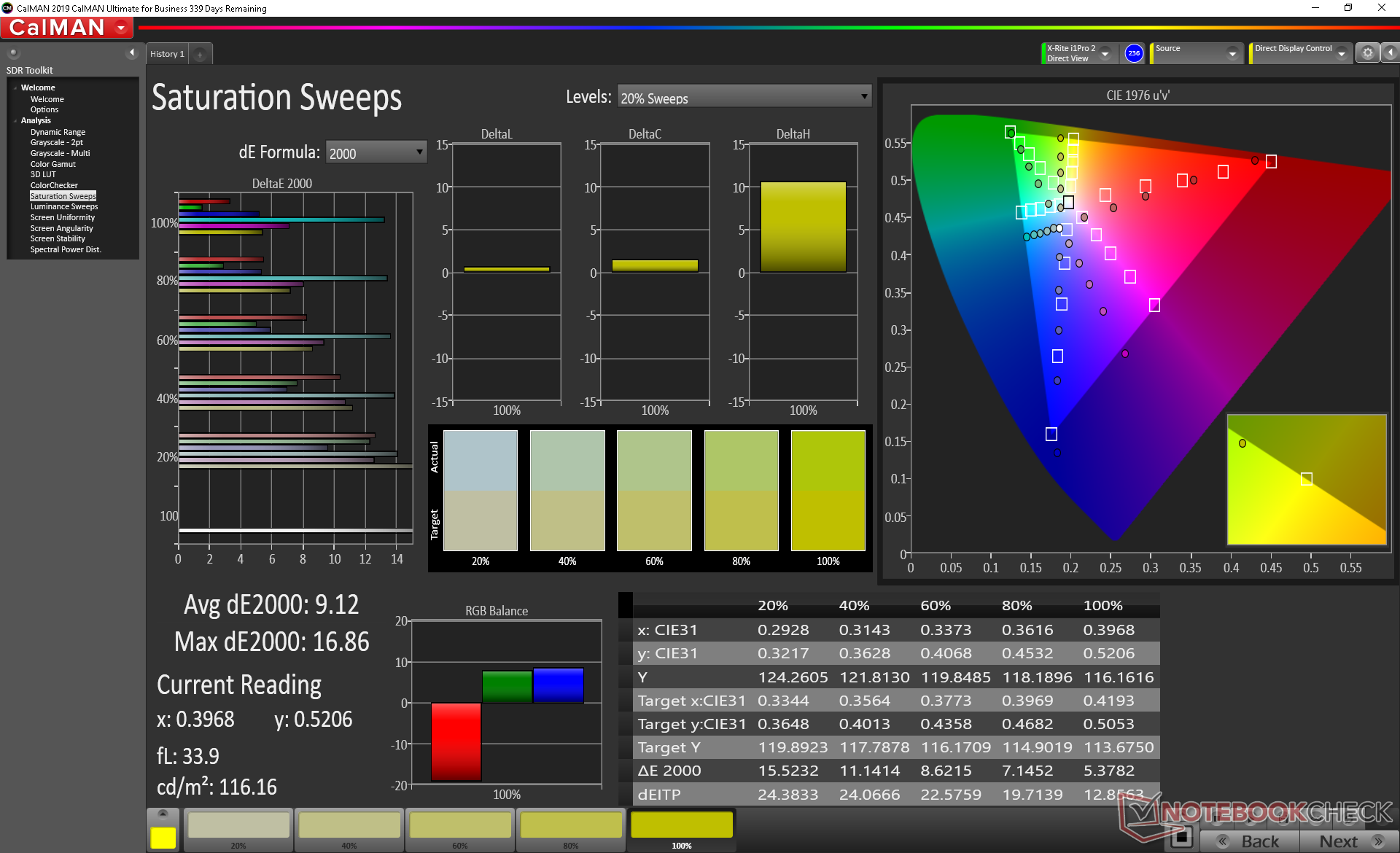 Unsere Messungen mit einem X-Rite-Spectrofotometer ergaben ein ab Werk schlecht kalibriertes Display mit einer zu kühlen Farbtemperatur von 11.176K und einer hohen durchschnittlichen DeltaE-Abweichung für Graustufen von 11,6. Dank der vorhin erwähnten hohen Farbraumabdeckung ist das Display aber zu viel mehr in der Lage wenn es ordentlich kalibriert wird. Farben und Graustufen konnten signifikant verbessert werden, wir empfehlen daher wenn möglich eine individuelle Kalibrierung. Alternativ kann natürlich auch auf unser oben verlinktes Farbprofil zurückgegriffen werden.