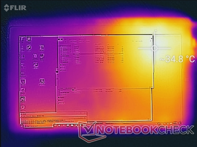 (+) Die maximale Temperatur auf der Oberseite ist 34.8 °C. Im Vergleich liegt der Klassendurchschnitt bei 35.4 °C (von 19.6 bis 60 °C für die Klasse Convertible).