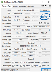 Weitere Informationen zur und Benchmarks der UHD Graphics 600 können der dieser GPU gewidmeten Seite entnommen werden.
