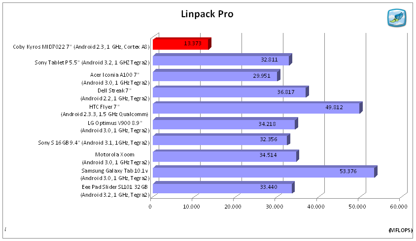 Im Linpack Pro Benchmark erreicht das Kyros 7022 13.373 MFLOS, den schlechtesten Wert der bisher von uns getesteten und aufgezeichneten Tablets. Ein Dell Streak 7" mit 1 GHz Tegra 2 kommt hier mit 36.817 MFLOPS beinahe auf den dreifachen Wert. Das Lenovo Ideapad A1 erzielt mit dem ARM Cortex A8 16.912 MFLOPS.