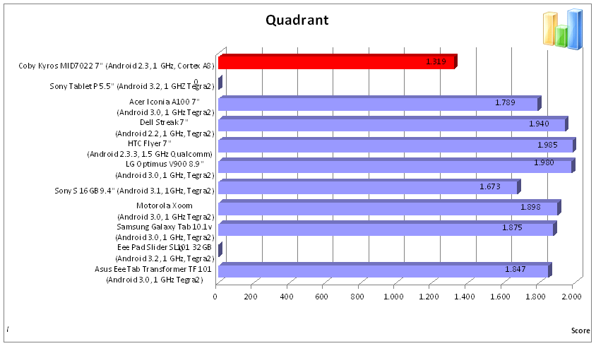 Als letztes unterzogen wir das Tablet noch dem Quadrant Benchmark, in dem es 1.319 Punkte erreicht. Das Dell Streak bringt es hier auf 1.940 und das Ideapad A1 von Lenovo auf 1.372 Punkte.