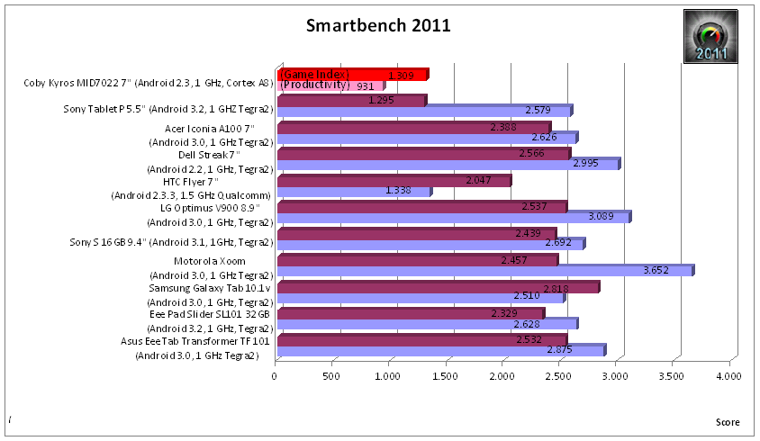 Im Smartbench 2011 Vergleich sieht es für das Kyros nicht besser aus: Hier reicht es für 1.309 Punkte (Game Index) bzw. 931 Punkte (Productivity). Das Dell Streak erlangt 2.566 (Game Index) und 2.995 Punkte (Productivity). Das Ideapad A1 bewegt sich mit 1.686 (Game Index) und 735 Punkten (Productivity) im Bereich unseres Coby.