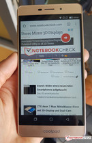 Im Freien leistet die Flüssigkristallanzeige überzeugende Arbeit. Inhalte sind bei direkter Sonneneinstrahlung aber nur schwer ablesbar. Die Blickwinkel sind IPS-typisch auf einem guten Niveau, jedoch dunkelt der Bildschirm bei sehr flachen Betrachtungswinkeln stark ab.