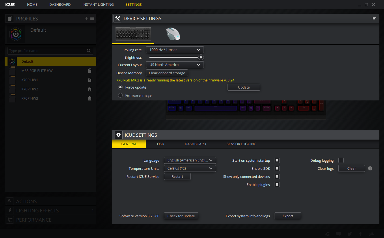 Laut Corsair liegt die Abfragerate der Tastatur bei 1.000 Hz. Wie wir in einem existierenden Artikel festgestellt haben, sind hohe Abfrageraten zwar für Gaming-Mäuse nützlich, bei Tastaturen jedoch relativ unnötig. Zusätzlich nehmen die ständigen Abfragen im Intervall von einer Millisekunde CPU-Ressourcen in Anspruch. Die K70 MK.2 Rapidfire verfügt über 8 MB Onboard-Speicher, auf dem bis zu drei Onboard-Profile gespeichert werden können. Diese Profile können mittels iCUE konfiguriert und auf die Tastatur übertragen werden - perfekt für LAN-Parties.