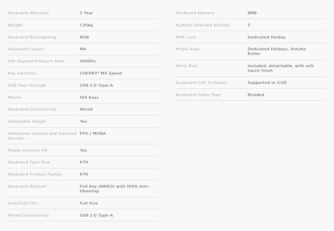 Corsair hat von der K95-RGB-Platin-Flaggschiffserie bis zur K65-Reihe viele Produkte aus dem Bereich "mechanische RGB-Tastaturen" im Sortiment. Die K70, von der es ganze 8 Varianten gibt, steht eigentlich für die Mittelklasse. Die K70-MK.2-Reihe ist zusätzlich noch in die Rapidfire- und die Rapidfire-Low-Profile-Kategorien aufgeteilt. Außerdem gibt es noch eine gänzlich weiße SE-Version der K70 MK.2 mit Double-Shot-PBT-Tastenkappen. Zusammen mit den verschiedenen Optionen bezüglich der Cherry-MX-Switches bekommen potenzielle Käufer eine sehr große Auswahl geboten.