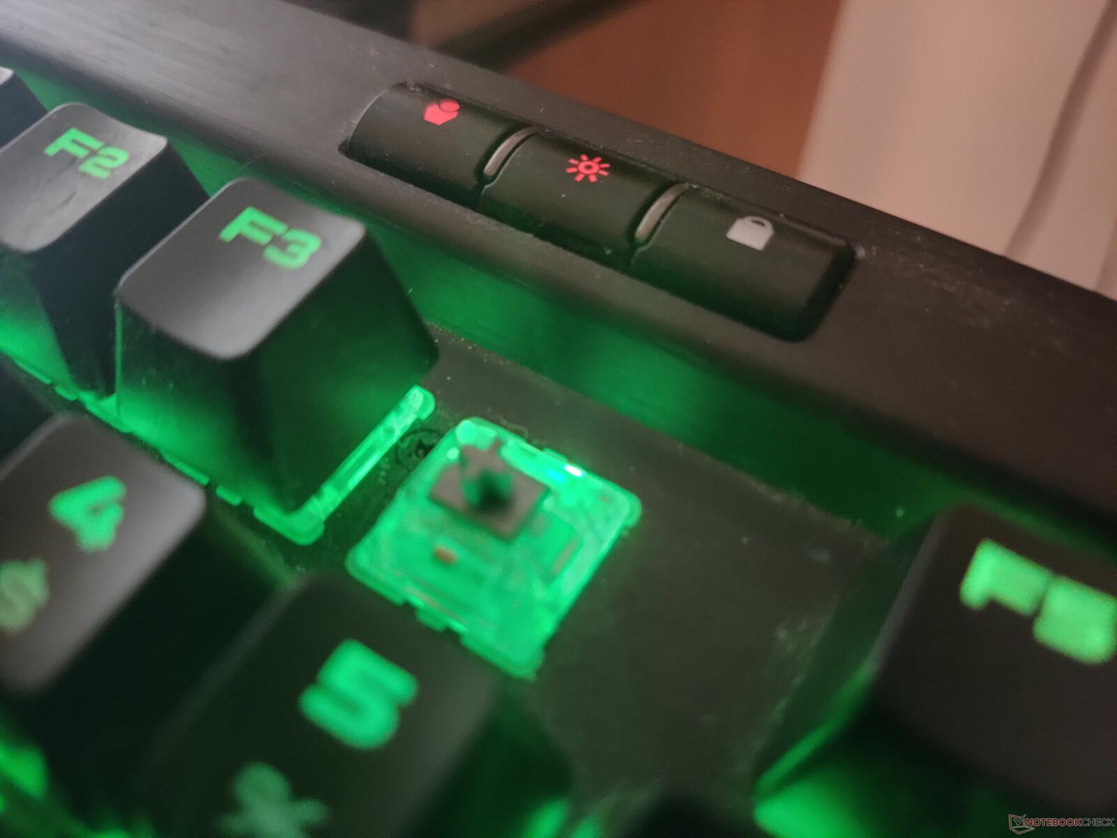 Oben links befinden sich drei nicht-mechanische Tasten, die Zugriff auf einige Zusatzfunktionen bieten. Mit der ersten kann man zwischen den abgespeicherten Onboard-Profilen wechseln, mit der zweiten kann die RGB-Leuchtkraft in drei Stufen angepasst oder deaktiviert werden und die dritte ist eine Windows-Tastensperre, die ein versehentliches Betätigen der Windows-Taste während des Spielens verhindert.