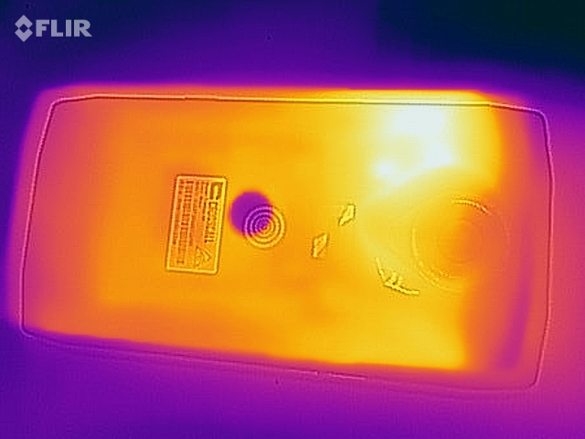 Die Temperaturentwicklung am Gehäuse ist bei eingeschaltetem, aber nicht unter Last stehendem Gerät erstmal recht unauffällig, lediglich im unteren, mittleren Bereich im Hochkantmodus gibt es einen minimal spürbare Erwärmung. Unter längerer Last jedoch erwärmt sich das Gerät an einigen Stellen auf bis zu 49,4 °C, das ist schon richtig warm und wenn man das Smartphone an dieser Stelle anfasst oder direkt nach dem Lastbetrieb in die Hosentasche steckt, auch unangenehm.