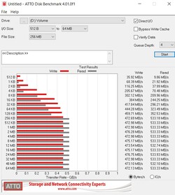 Der ATTO-Benchmark verwendet unterschiedlich große Datenblöcke, um die Leistung der SSD noch praxisnäher überprüfen zu können.