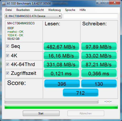Am mSATA-Port in Notebooks wird diese Geschwindigkeit unserer Erfahrung nach nicht erreicht, da die bisher von uns getesteten Rechner den mSATA-Steckplatz alle per SATA II (max. 3 Gbit/s) angebunden hatten. Damit greift die Limitierung bei etwa 270 MB/s, wodurch ein Teil der Transfergeschwindigkeit folglich verloren geht. Für den subjektiven Geschwindigkeitsvorteil ist diese Einschränkung jedoch nur wenig relevant, da hier vor allem die Zugriffszeiten und die Geschwindigkeit bei zufälligen Zugriffen den Ausschlag geben. Die Benchmarkergebnisse sind daher in diesen Teilbereichen, egal ob mit SATA II oder SATA III angebunden, nahezu identisch.
