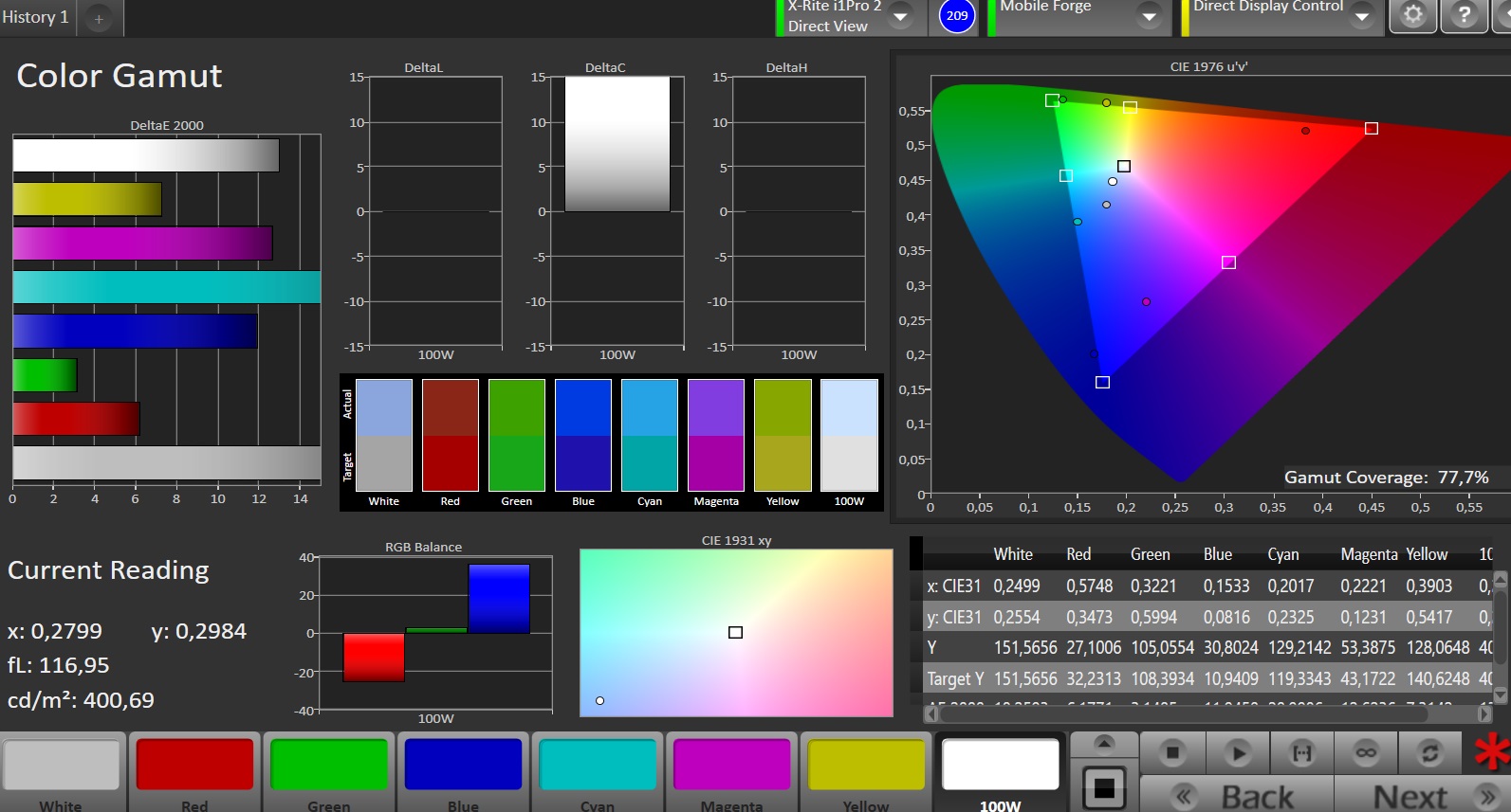 Auf dem Bildschirm sind immer wieder Farbverschiebungen sichtbar und unser Spektralfotometer erkennt zusammen mit der Software CalMAN einen heftigen Blaustich. Farben werden stark verfälscht wiedergegeben.