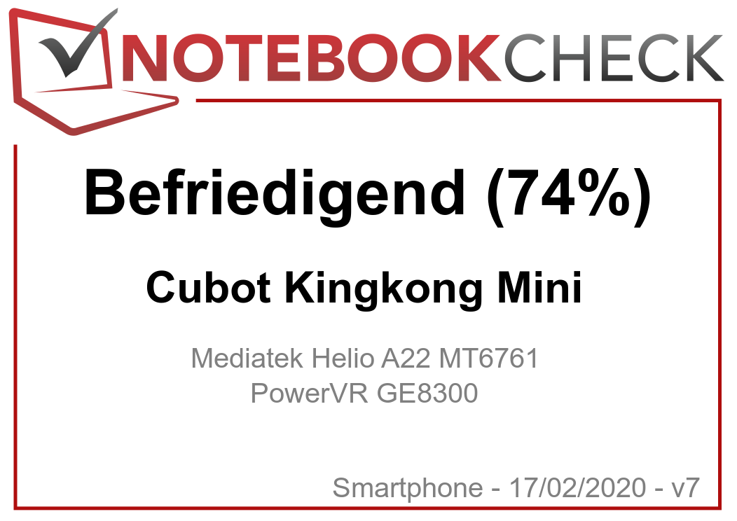 | 73.5 % v7 (old) | v7 (old) | 02 / 2020 | Cubot Kingkong Mini Helio A22 MT6761, PowerVR GE8300 | 124 g | 32 GB eMMC Flash | 4.00" | 1080x540 | |