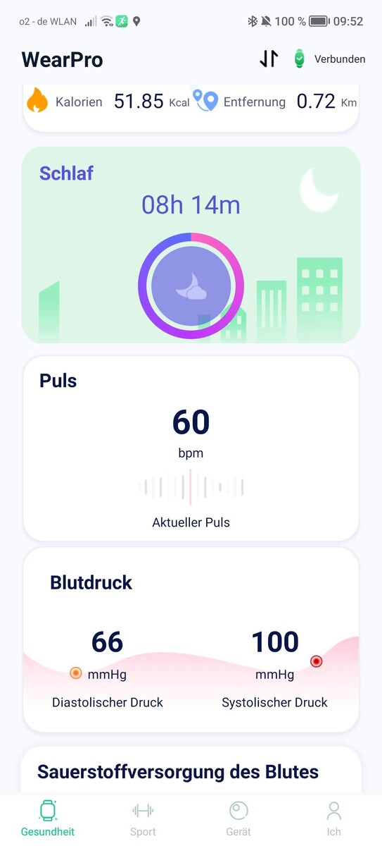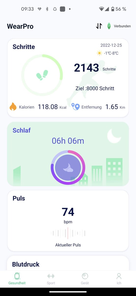 Die Fitnessdaten der DT8 Ultra werden in der WearPro-App gesammelt. Unter dem Reiter Gesundheit zeigt die Software prominent aktuell absovierte Schritte und das Schrittziel, die zurückgelegte Distanz und die verbrannten Kallorien an. Außerdem eine Übersicht über die Themen Schlaf, Puls, Blutdruck, Sauerstoffversorgung des Blutes und die Temperatur.