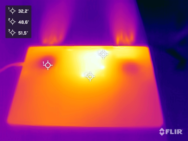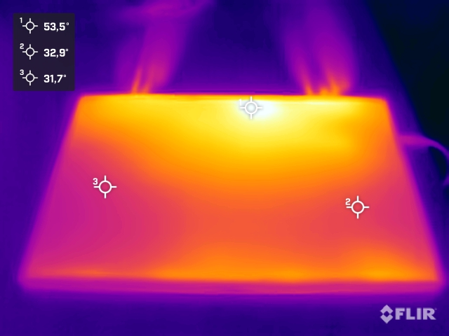 (-) Auf der Unterseite messen wir eine maximalen Wert von 54.8 °C (im Vergleich zum Durchschnitt von 36.8 °C).