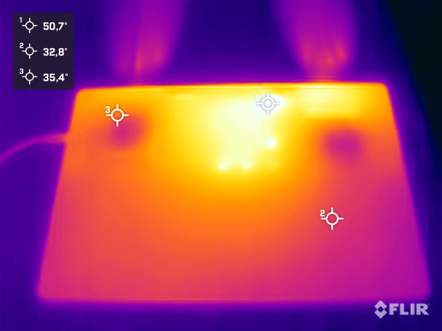 (+) Die Handballen und der Touchpad-Bereich erreichen maximal 34.8 °C und damit die typische Hauttemperatur und fühlen sich daher nicht heiß an.