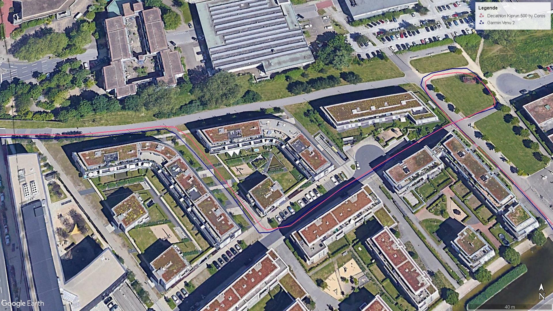 Coros verspricht eine GPS-Messung in drei verschiedenen Modi: GPS / GPS + GLONASS / GPS + Beidou. Auf die Auswahl hat der Nutzer aber keinen Einfluss. Allerdings ist es möglich, dass die Uhr über die App Zugriff auf die GPS-Daten des Smartphones bekommt, um eine schnelle GPS-Ortung zu ermöglichen, wenn der Träger das wünscht. Im Test benötigte die Kiprun 500 trotz der aktivierten schnelleren GPS-Ortung meist zehn Sekunden im Freien, bis eine Verbindung hergestellt wurde. Eine App für Navigation gibt es nicht. Allerdings können getrackte Routen als GPX-Dateien über die Coros-App exportiert werden. Importierte Routen können aber mit der Kiprun 500 nicht synchronisiert werden. Die Genauigkeit der Daten überzeugt: zwischen den Messwerten der Kiprun 500 und dem Referenzgerät, der Garmin Venu 2, liegen nach einer fünf Kilometer langen Biketour nur vier Meter Unterschied. Leider bietet die Decathlon Uhr keine Höhenmessung, daher fehlen Höhenprofile.