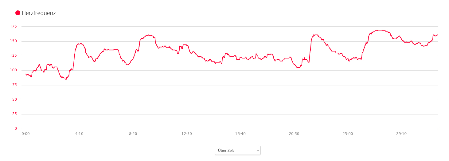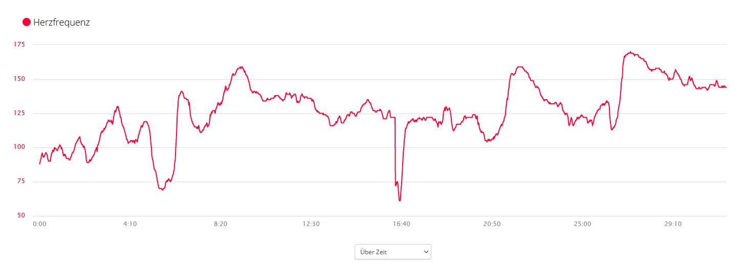 Um die Genauigkeit der Herzfrequenz zu bestimmen, tritt die Decathlon Kiprun 500 gegen die Garmin Venu 2 an. Dabei zeigt sich, dass beide Uhren die jeweiligen Pulsspitzen und Verläufe ähnlich darstellen, die Frequenz bei der Garmin-Uhr jedoch bedeutend mehr schwankt. Bei den sinkenden Pulswerten ist nicht etwa der Sensor verrutscht, sondern es wurden kurze Pausen gemacht. Diese Pausen mit sinkender Pulsfrequenz erfasst die Kiprun nicht bzw. nicht im gleichen Ausmaß wie die Garmin.