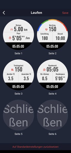 Was über die Uhr nicht gesteuert werden kann, wird über die App eingestellt. Sehr individuell ist etwa die Ansicht in den einzelnen Sportarten wählbar. Denn für neun verschiedene Sportarten kann der Nutzer einzeln die Anordnung des Displays ändern. Dabei können sechs verschiedene Seiten - die während des Trainings mit den Pfeiltasten durchgeblättert werden - sowohl in der Aufteilung als auch von Daten frei bestückt werden. Damit ist ein hohes Maß an Individualisierung für die Trainingsbedürfnisse möglich. Außerdem kann in der App die Auswahl der angezeigten Trainings im Trainingsmenü (Knopf unten links) sowohl in der Anzahl als auch in der Positionierung angepasst werden. Das gleiche gilt für die Programme der Toolbox (Wecker, Timer etc.). In Sachen Benachrichtigungen kann lediglich festgelegt werden, welche Apps eine Nachricht an die Uhr senden dürfen. Ein Widget gibt es für die Coros-App unter Android nicht.