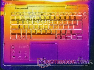 Die Oberflächentemperaturen sind im Leerlauf wärmer als erwartet. Im hinteren Bereich der Basiseinheit werden sogar 31 °C erreicht. Die Handballenablage bleibt im Vergleich dazu mit 21 °C relativ kühl. Bei maximaler Belastung erreicht ein Hotspot an der Unterseite der Basiseinheit über 42 °C. Zum Glück verändert sich die Temperatur auf der Tastatur und der Handballenablage kaum, weshalb Hände und Finger nie unangenehm warm werden sollten. Dennoch ist bemerkbar, dass die linke Seite des Geräts immer wärmer ist als die rechte. Das hat mit der Positionierung des Prozessors zu tun.