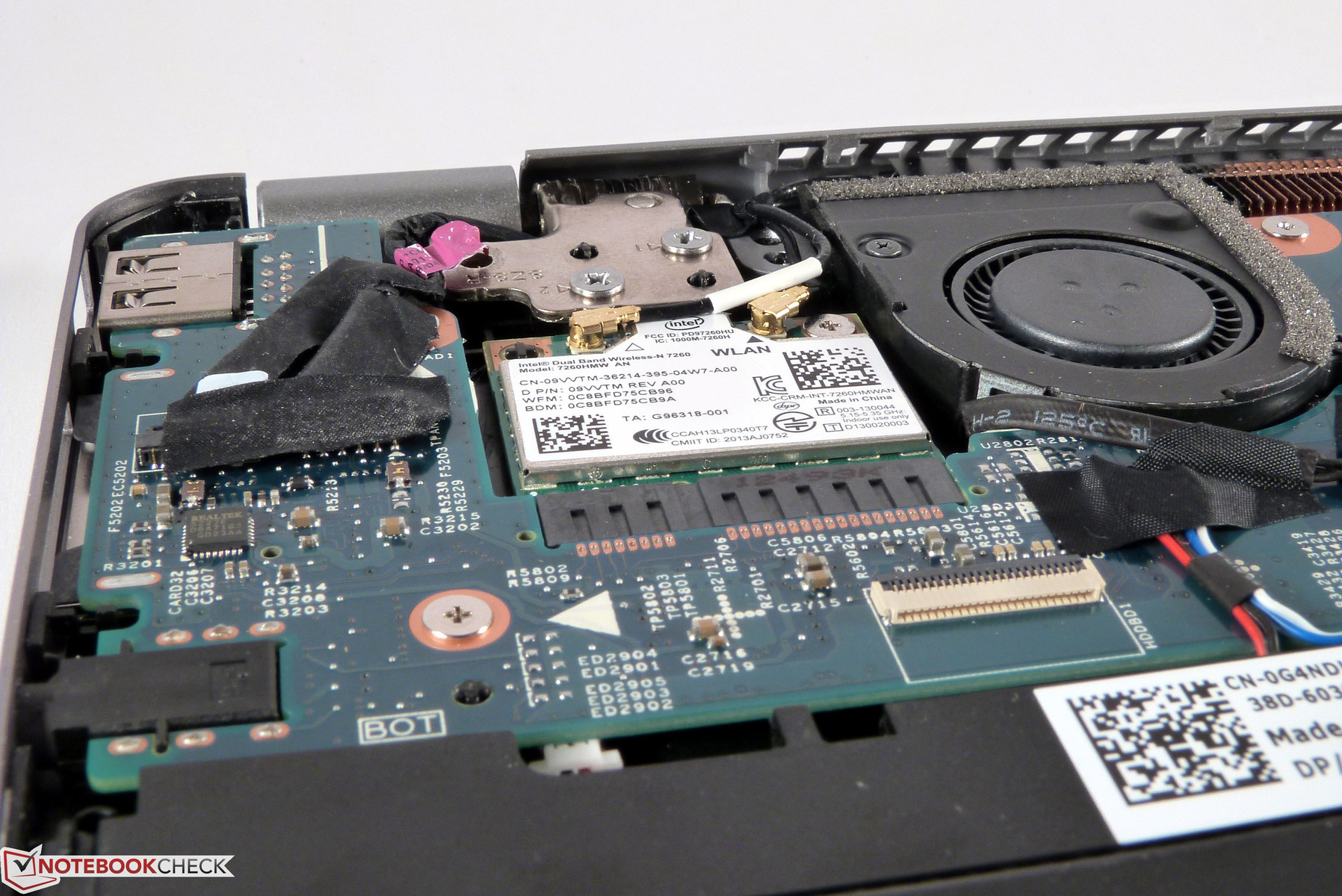 Der flachen Bauform geschuldet ist das kompakte und komprimierte Innenleben des Inspiron. Der Akku ist fest verbaut und lässt sich vom Nutzer nicht ohne weiteres wechseln - selbst nicht nach Öffnen der Wartungsklappe. Generell legt Dell nur wenig Wert darauf, dass der Nutzer selbst am Notebook herumschraubt. Der Boden des Notebooks lässt sich zwar entfernen und gibt dann einen Blick auf das Innere frei, wirklich komfortabel ist dieser Vorgang aber nicht.