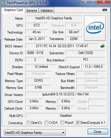 Als Grafikkarte kommt im Inspiron die im Prozessor integrierte Intel HD Graphics 3000 zum Einsatz. Mit guten 3965 Punkten im 3DMark 06 und ebenfalls ordentlichen 1785 Punkten im 3dMark Vantage kann sie fast alle andere Notebooks mit gleicher Grafikkarte übertrumpfen. Deutlich darüber agieren allerdings dedizierte Grafikkarten, wie die gerne verbaute Grafikkarte GeForce GT 540M von Nvidia, die meist die doppelte Punktzahl einfährt.